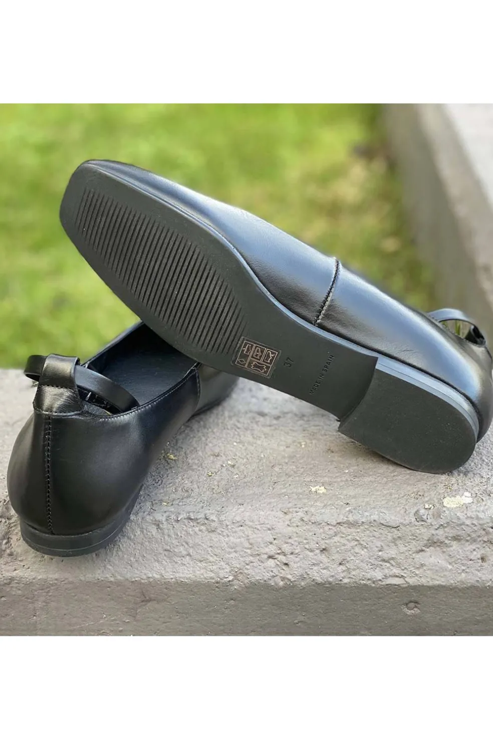 Bailarina de mujer Bryan con piel negro, con pulsera con hebilla al tobillo, lo que permite un mayor ajuste. Puntera redondeada y tacón plano. Diseñada y fabricada en España artesanalmente.