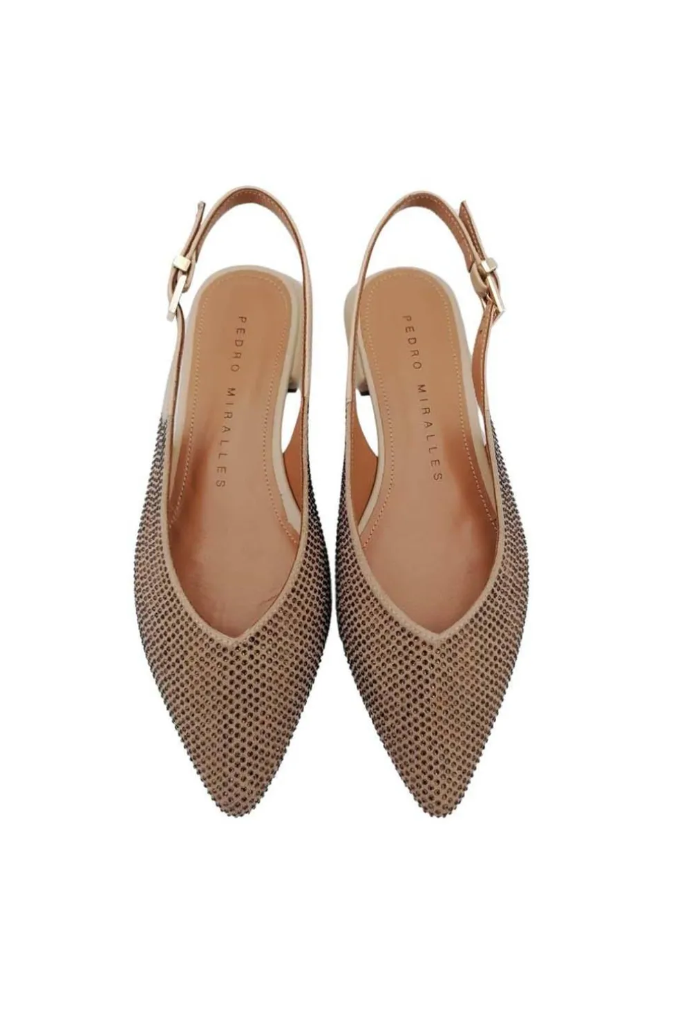 Bailarinas destalonadas de piel en color beige. Este diseño recubierto de piedras brillantes pequeñas son una fusión perfecta entre la sofisticación y el lujo, creando un calzado que roba miradas con cada paso. Altura tacón: 2 cm.