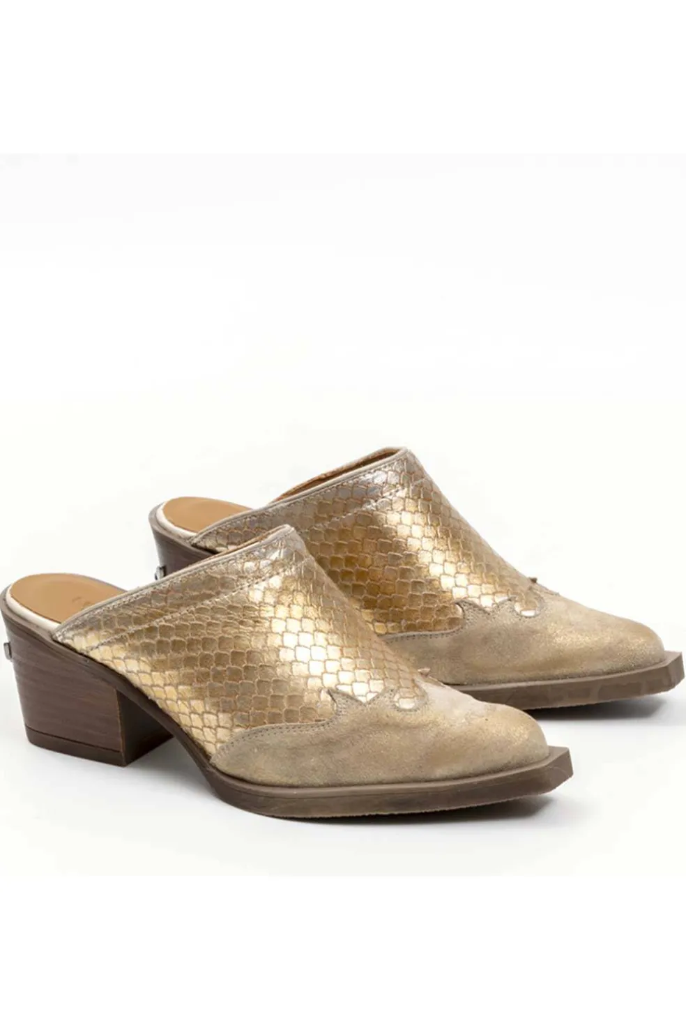 Zueco de piel con un sofisticado efecto serpiente brillante, este calzado destaca por su diseño moderno y atractivo.Fabricado en España