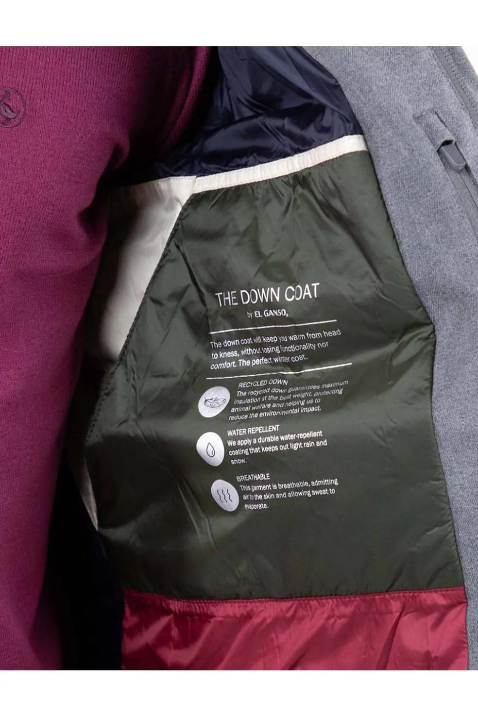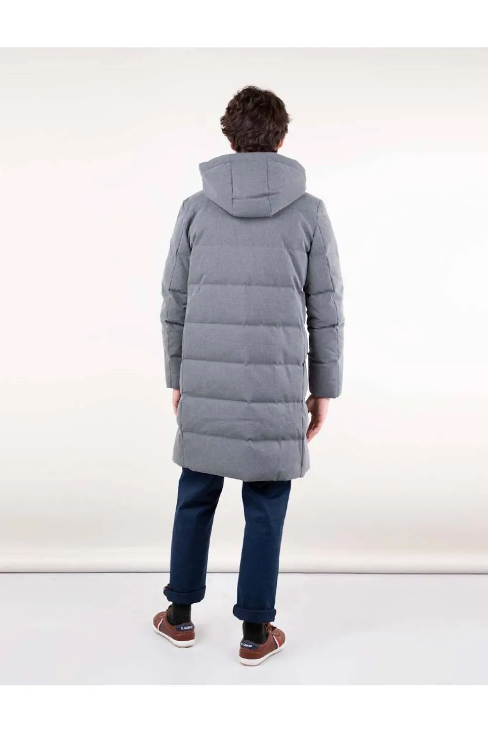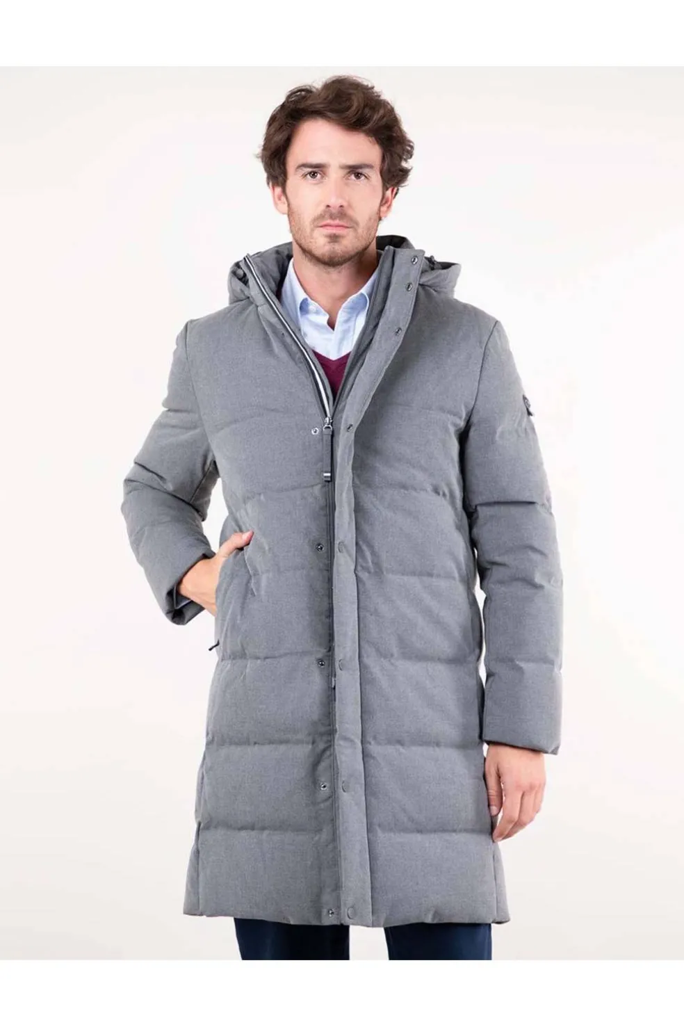 Abrigo largo acolchado de hombre confeccionado en tejdo afranelado de poliéster, rayón y spandex repelente al agua. Relleno interior de pluma reciclada. Corte Regular Fit. Cuello con capucha desmontable con cremallera. Cierre con cremallera y tapeta con snaps. Lleva como detalle una cinta de bandera en la tapeta interior. Tiene bolsillos interiores. Este producto talla más grande de lo habitual, recomendamos elegir una talla menos.