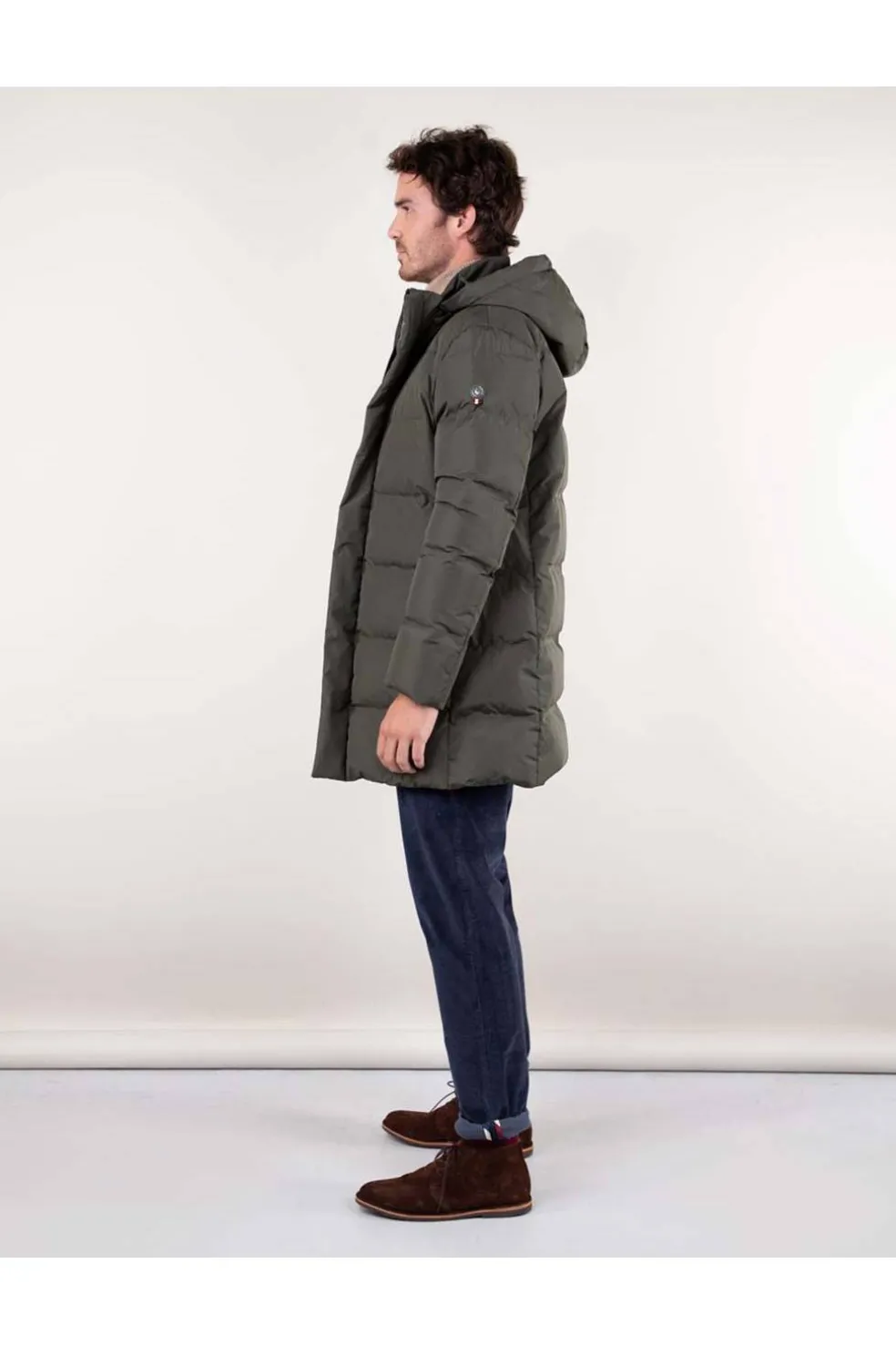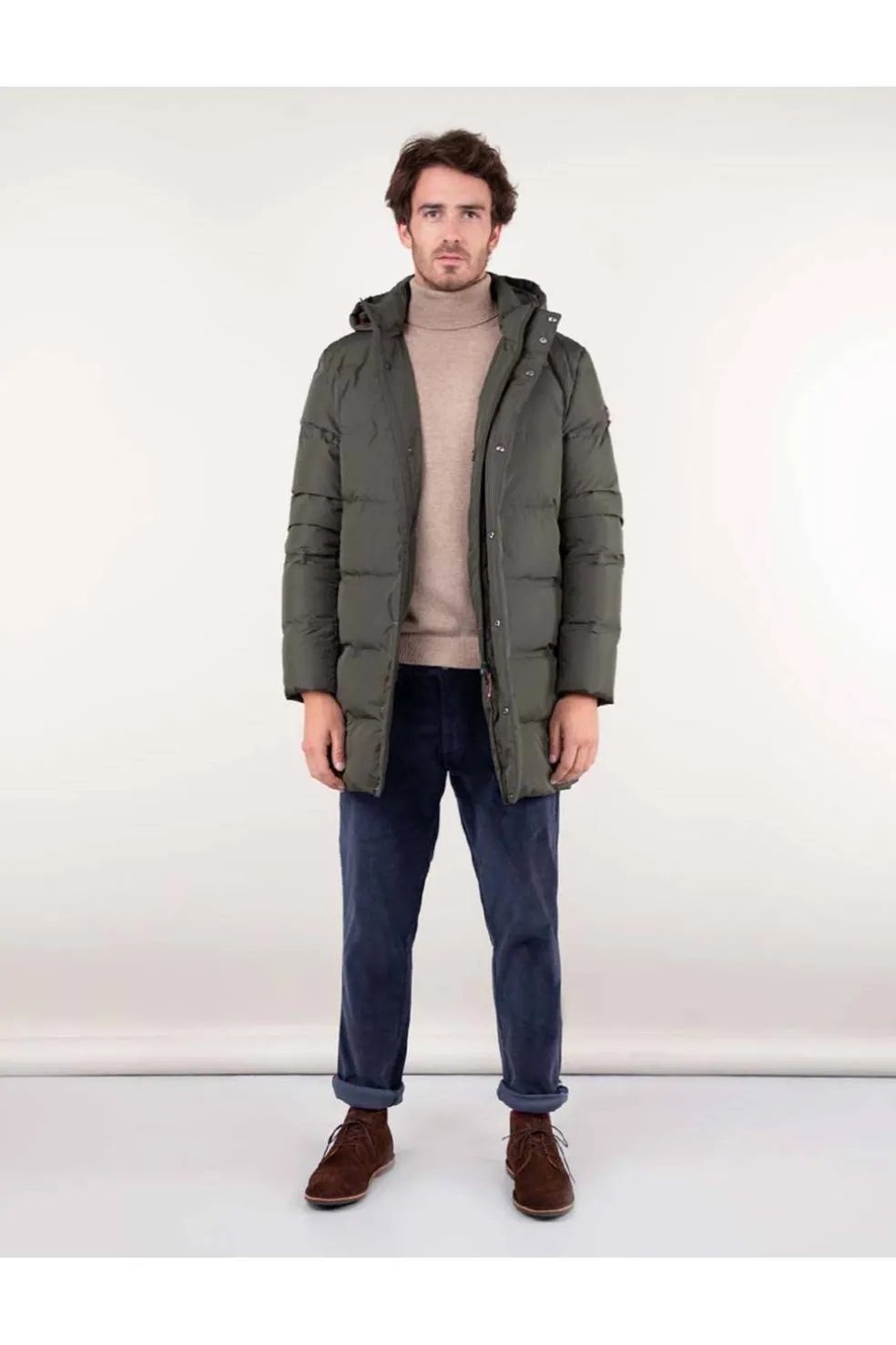 Abrigo largo acolchado de hombre. Relleno interior de pluma reciclada. Tejido de poliéster repelente al agua. Corte Regular Fit. Cuello con capucha desmontable con cremallera. Cierre con cremallera y tapeta con snaps. Detalle de cinta de bandera en la tapeta interior.