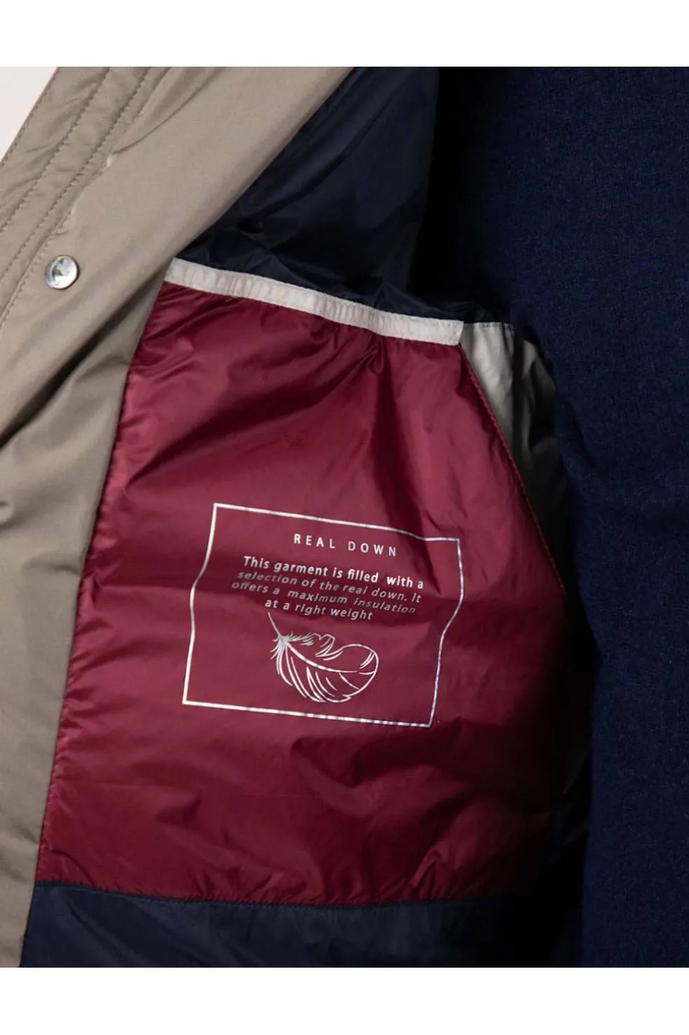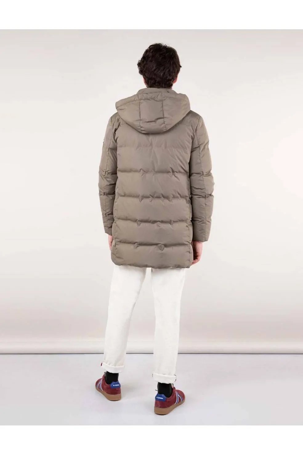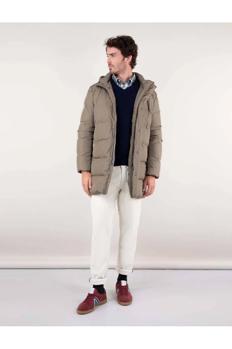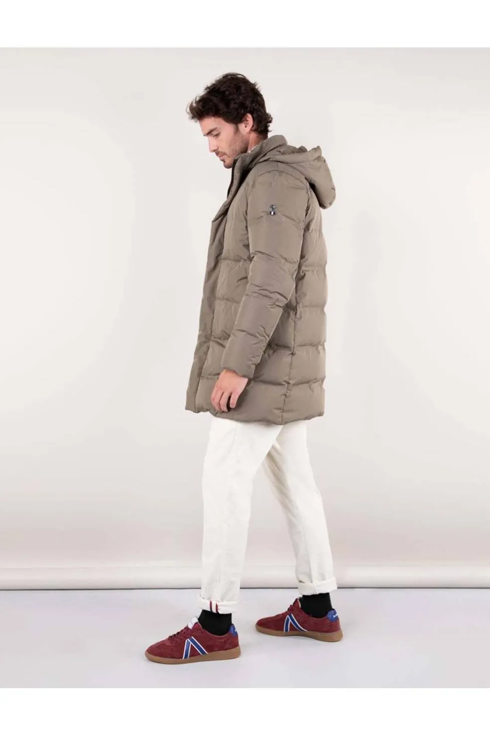 Abrigo largo acolchado de hombre. Relleno interior de pluma reciclada. Tejido de poliéster repelente al agua. Corte Regular Fit. Cuello con capucha desmontable con cremallera. Cierre con cremallera y tapeta con snaps. Detalle de cinta de bandera en la tapeta interior.