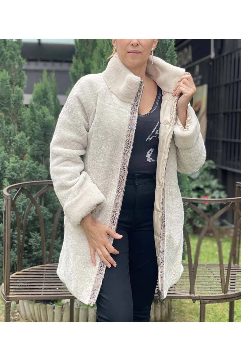 Abrigo corto de piel natural, mouton semirizado de cordero. Con cremallera maxi en el lateral con el vivo de serpiente. Es reversible y el interior es de tipo nylon de gabardina. El largo es de 80 cm.