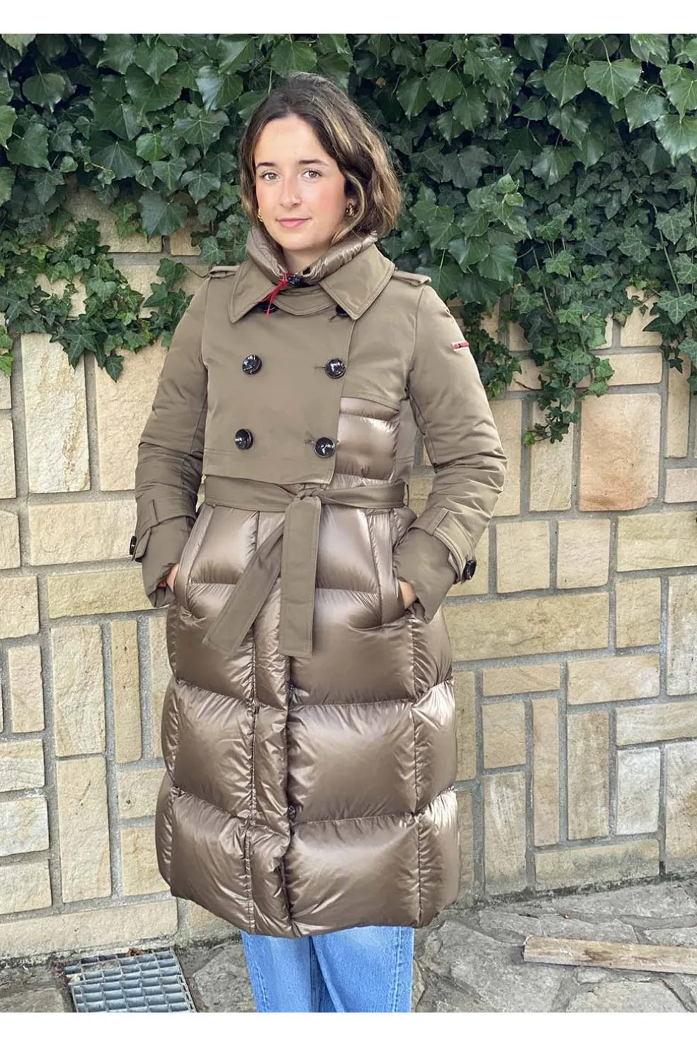 El plumífero modelo CATHERINA tiene un original diseño con detalle estilo trench superpuesto sobre el plumífero. Con largo hasta la rodilla, cierre central con cremallera con solapa, y cuello alto.