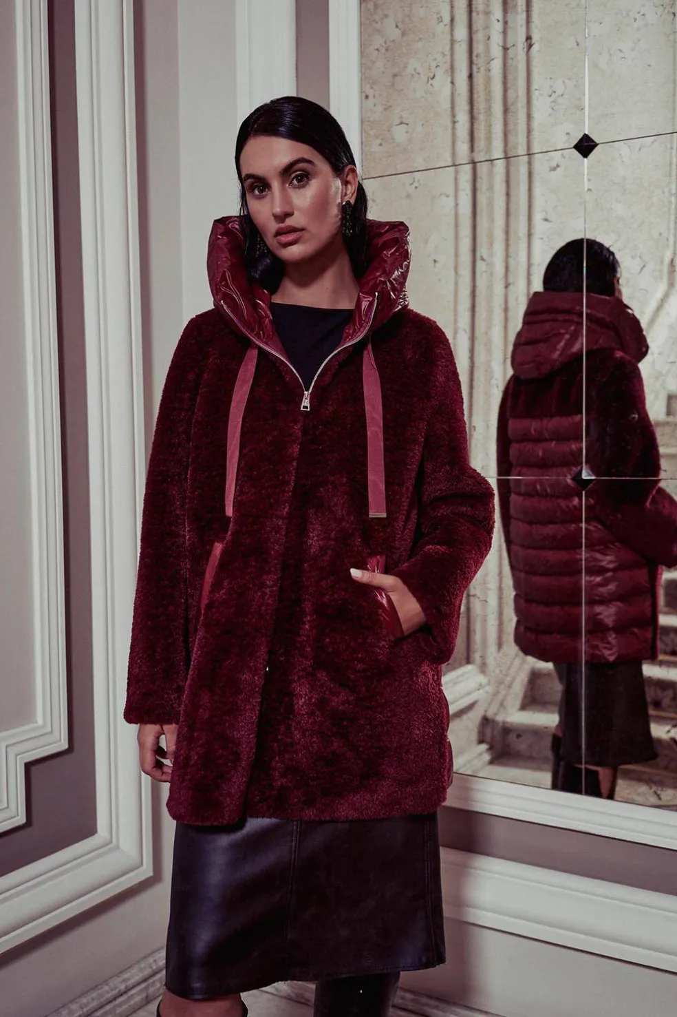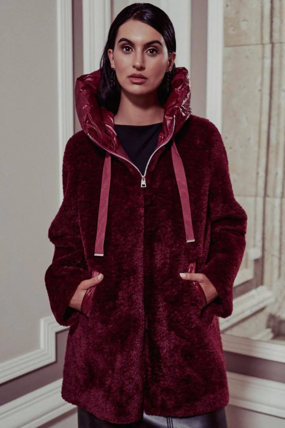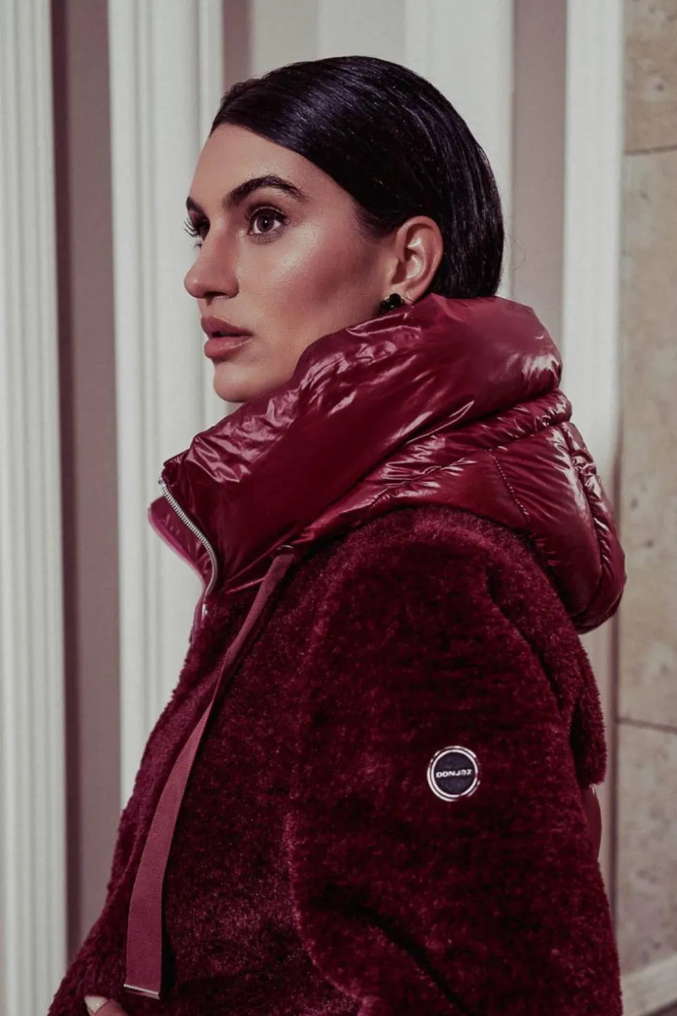 Prenda de mujer Donjaz, modelo Keiki, en elegante color burdeos. Presenta un exterior de pelo muy suave con detalles acolchados en bolsillos, cuello y espalda. Cuenta con dos bolsillos laterales y cierre con cremallera, combinando estilo, confort y funcionalidad.