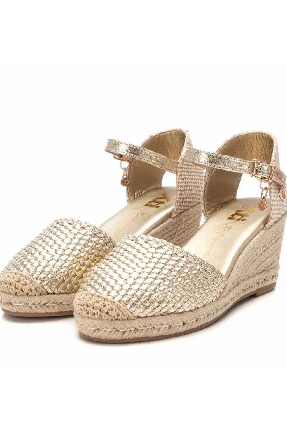 Alpargata tipo valenciana de mujer de la marca Xti. Fabricada en material textil con acabado metalizado. Cierre mediante hebilla. Cuña de yute con suela de goma antideslizante.