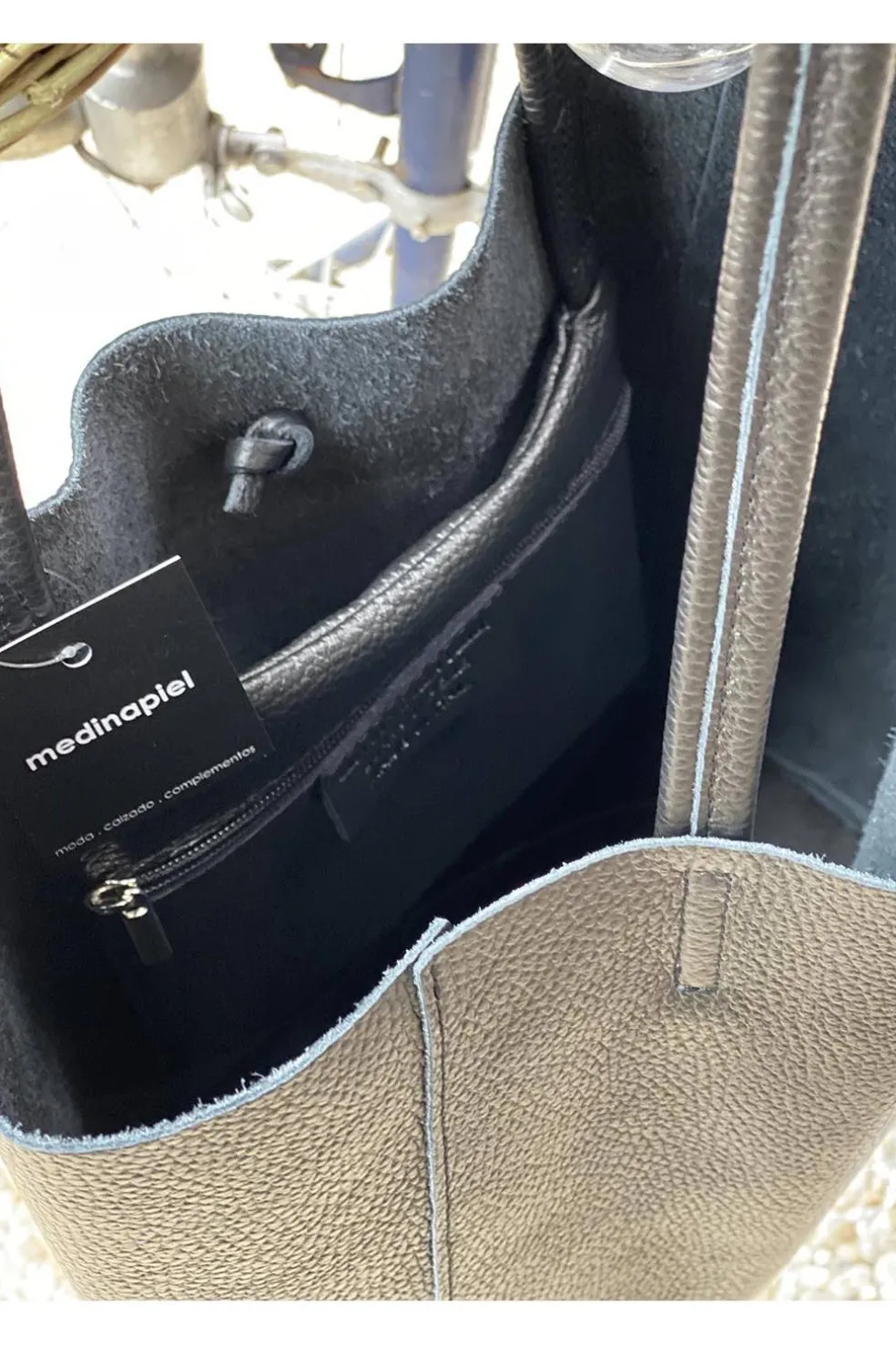 Descubre el elegante bolso shopping de piel negro de Medinapiel, perfecto para el día a día. Con un diseño moderno y funcional, cuenta con un pequeño compartimento interior con cremallera para tus objetos esenciales. Sus asas permiten colgarlo cómodamente en el hombro, mientras que el cierre con cordones añade un toque distintivo. Ideal para quienes buscan estilo y practicidad en un solo accesorio.