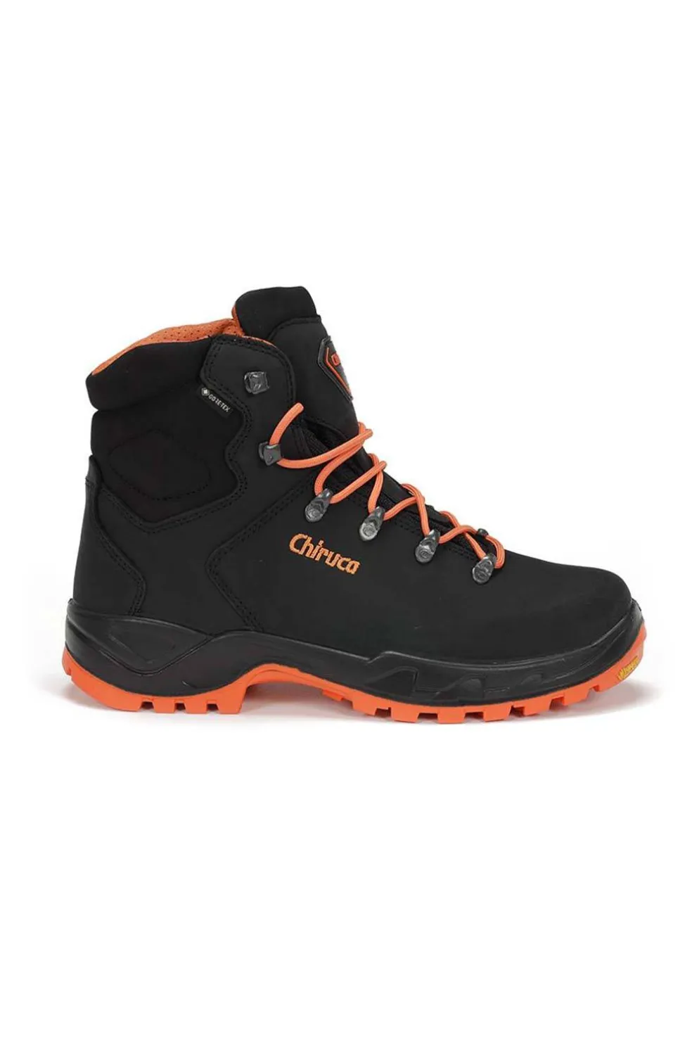 Piel nobuck hidrofugada. Cuello napa. Cordura® hidrorrepelente. Forro GORE-TEX® Performance Comfort. Entresuela poliuretano Xtra. Patín de caucho Vibram® Stone. Peso: 629 g.