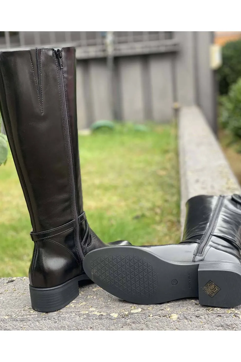 Bota Medinapiel con forro de tejido y cremallera lateral y elástico. Tiene una altura de caña de 38 cm y tacón de 3,5 cm.