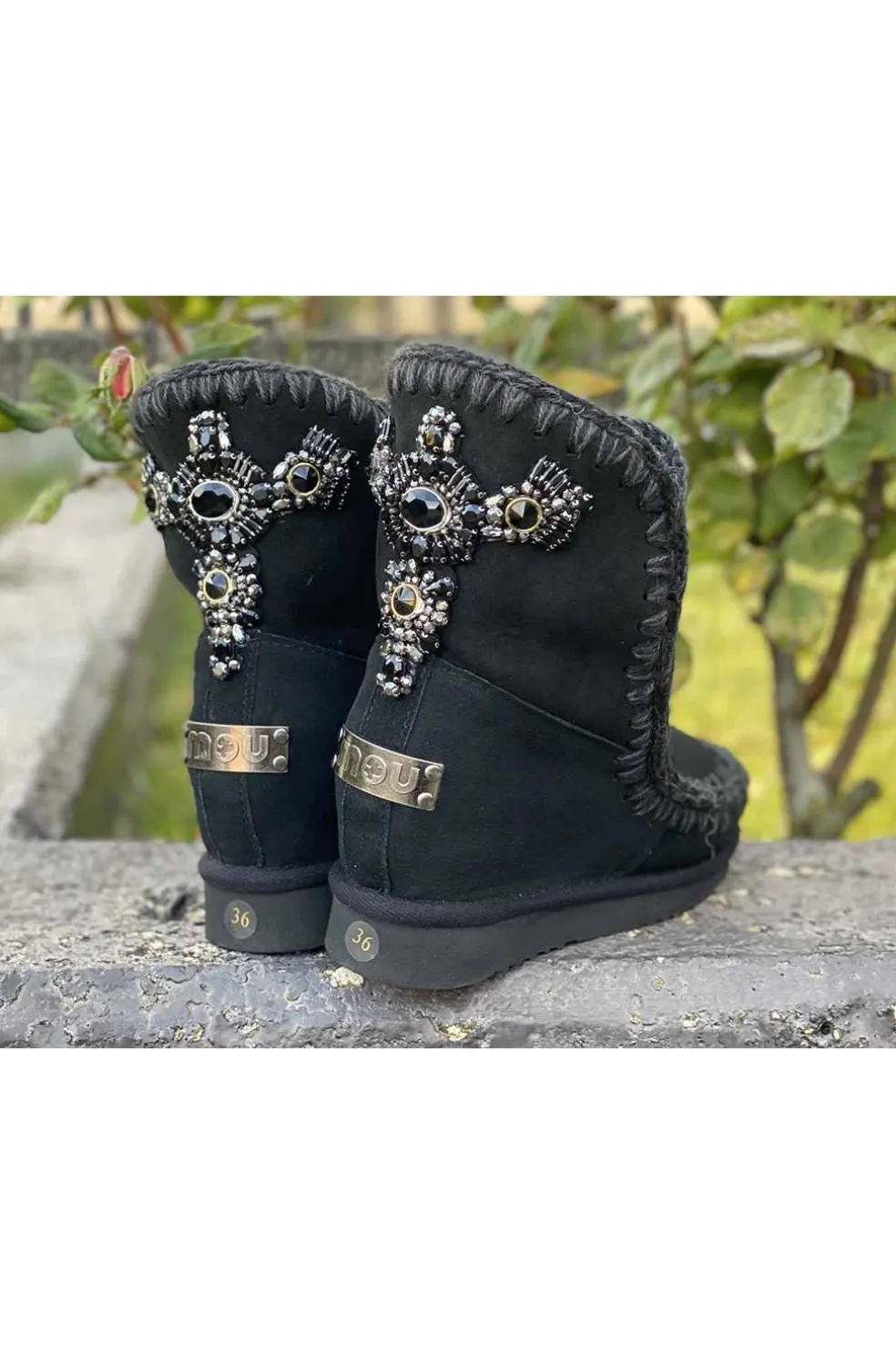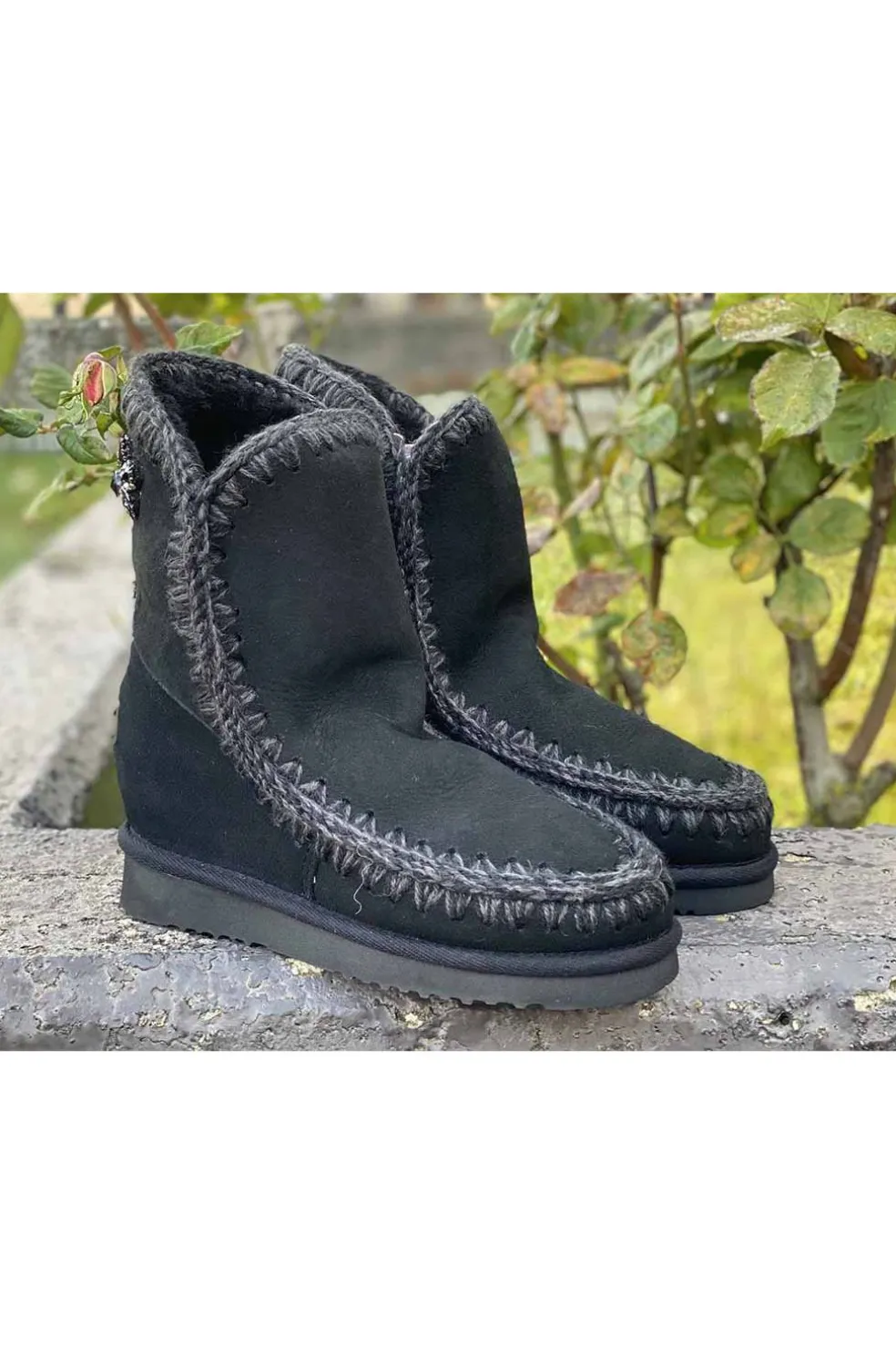 Estas botas MOU bajas con parche posterior con forma de cruz representan lo mejor del icono mou con un tacón oculto de 5 cm y una forma más estilizada. Increíblemente cómodas y favorecedoras, este modelo está elaborado con suave piel genuina de oveja, con costuras de lana tejidas a mano, un soporte de refuerzo para el talón y una resistente suela de EVA. Altura 23 cm.