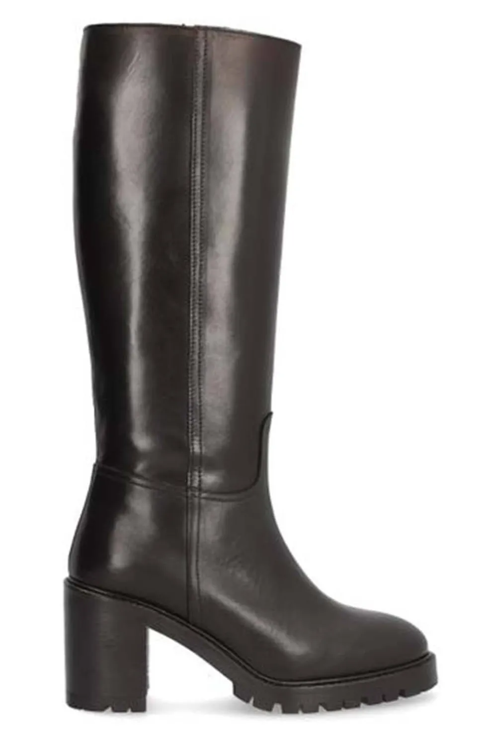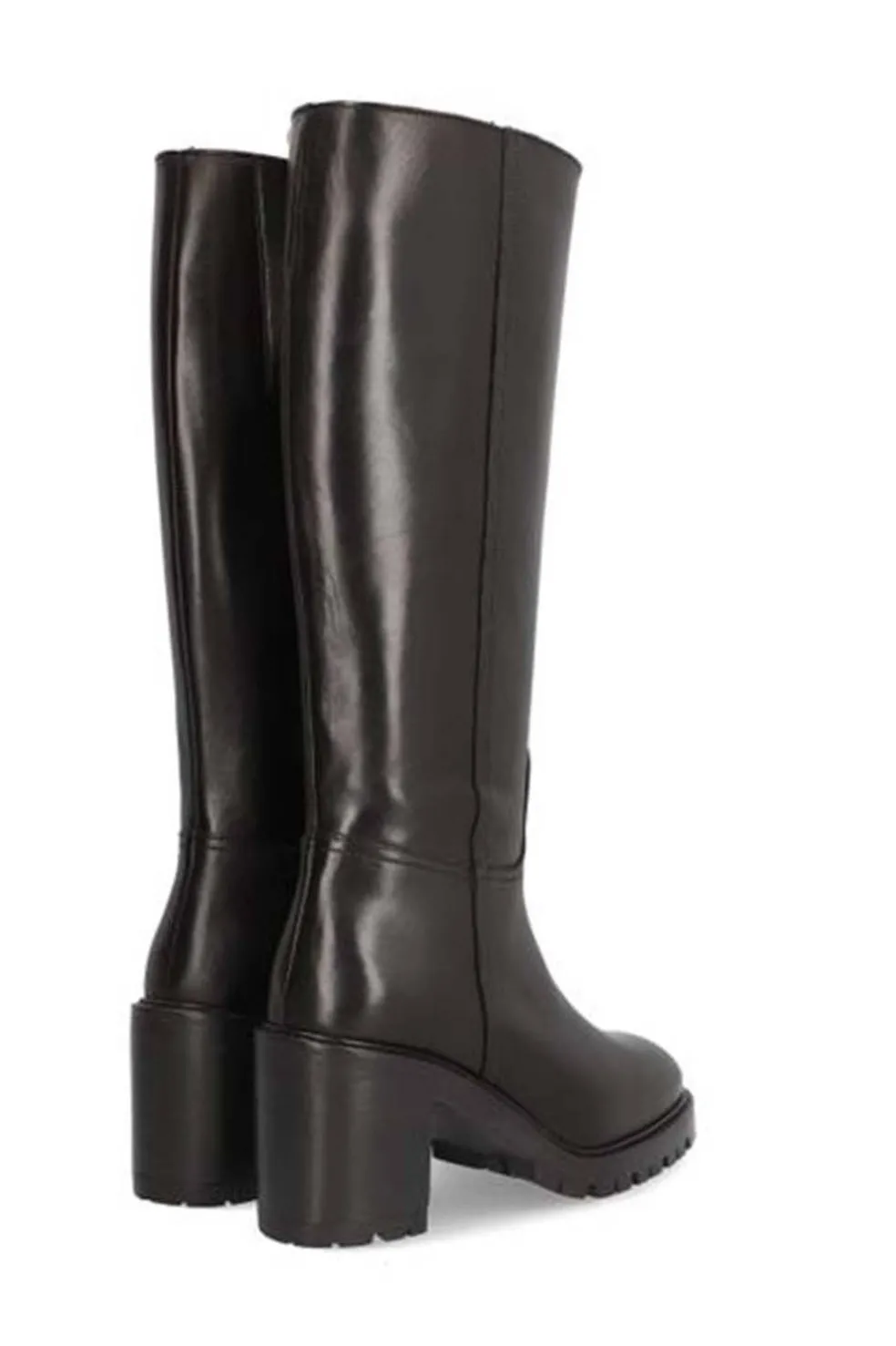 Bota ALPE para mujer en piel de color negro, tacón de 8 cm, suela antideslizante, puntera redonda, cierre mediante cremallera y caña alta.