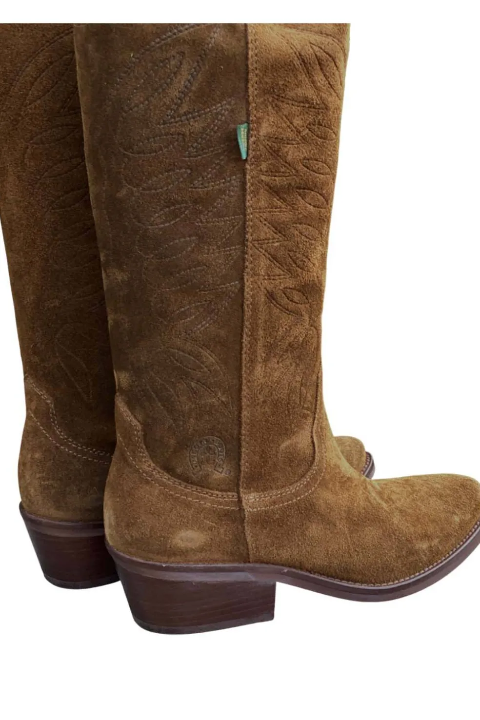 Bota campera de piel en color marrón, sin cremallera, con elegante acabado en punta y bordado tonal que realza su diseño. Tacón de 5 cm y caña de 34 cm para un estilo clásico y atemporal. Fabricada 100 % en Valverde del Camino con la garantía de calidad de Dakota Boots.