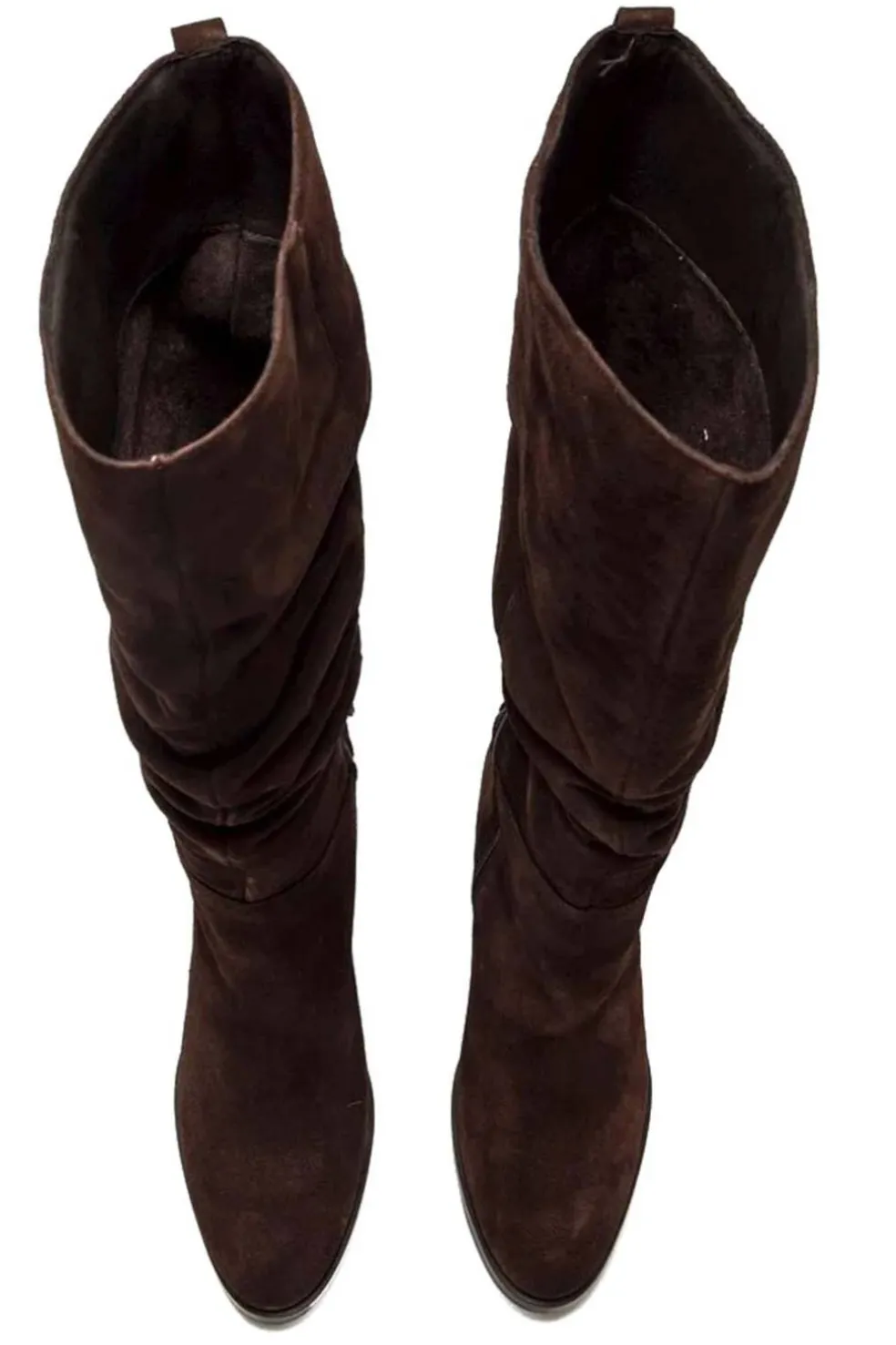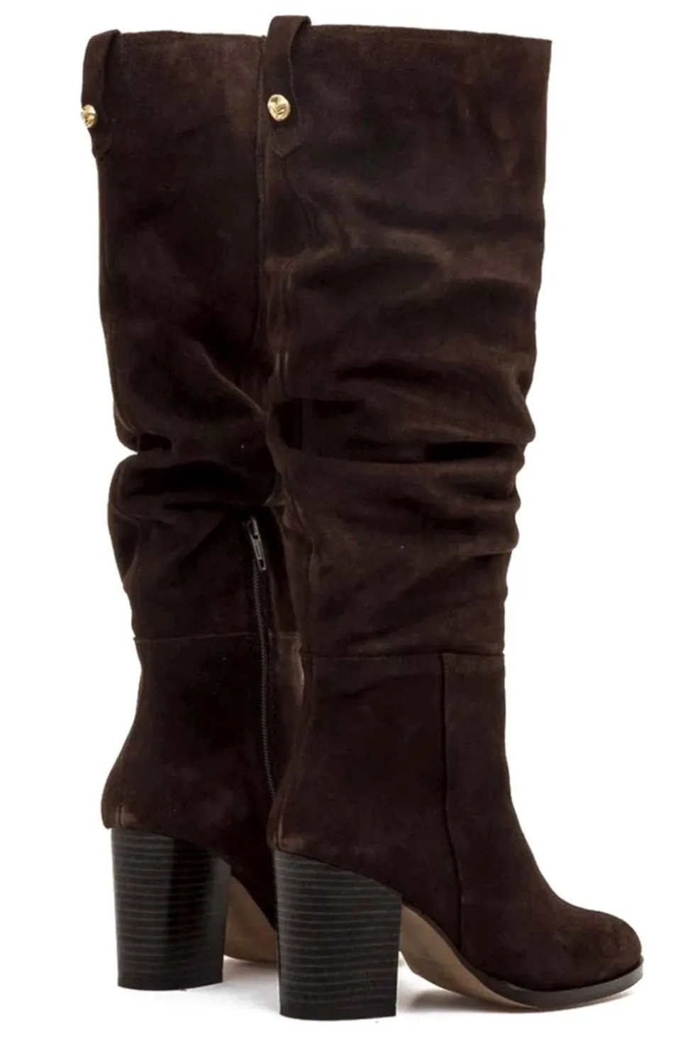 Botas altas de tacón para mujer de la marca Mustang, modelo Rose de color moka con acabado de serraje. Fabricado con piel que proviene de fabricantes aprobados por el protocolo «Leather Working Group», donde evalúan el cumplimiento ambiental y el desempeño, promoviendo prácticas comerciales ambientales sostenibles dentro de la industria del cuero. La caña amplia con efecto fruncido aporta un estilo desenfadado, mientras que el tacón ancho eleva la figura. El detalle trasero con tira y botón metálico le añade un toque decorativo sutil. Esta bota combina funcionalidad y estilo para looks urbanos durante los meses más fríos.