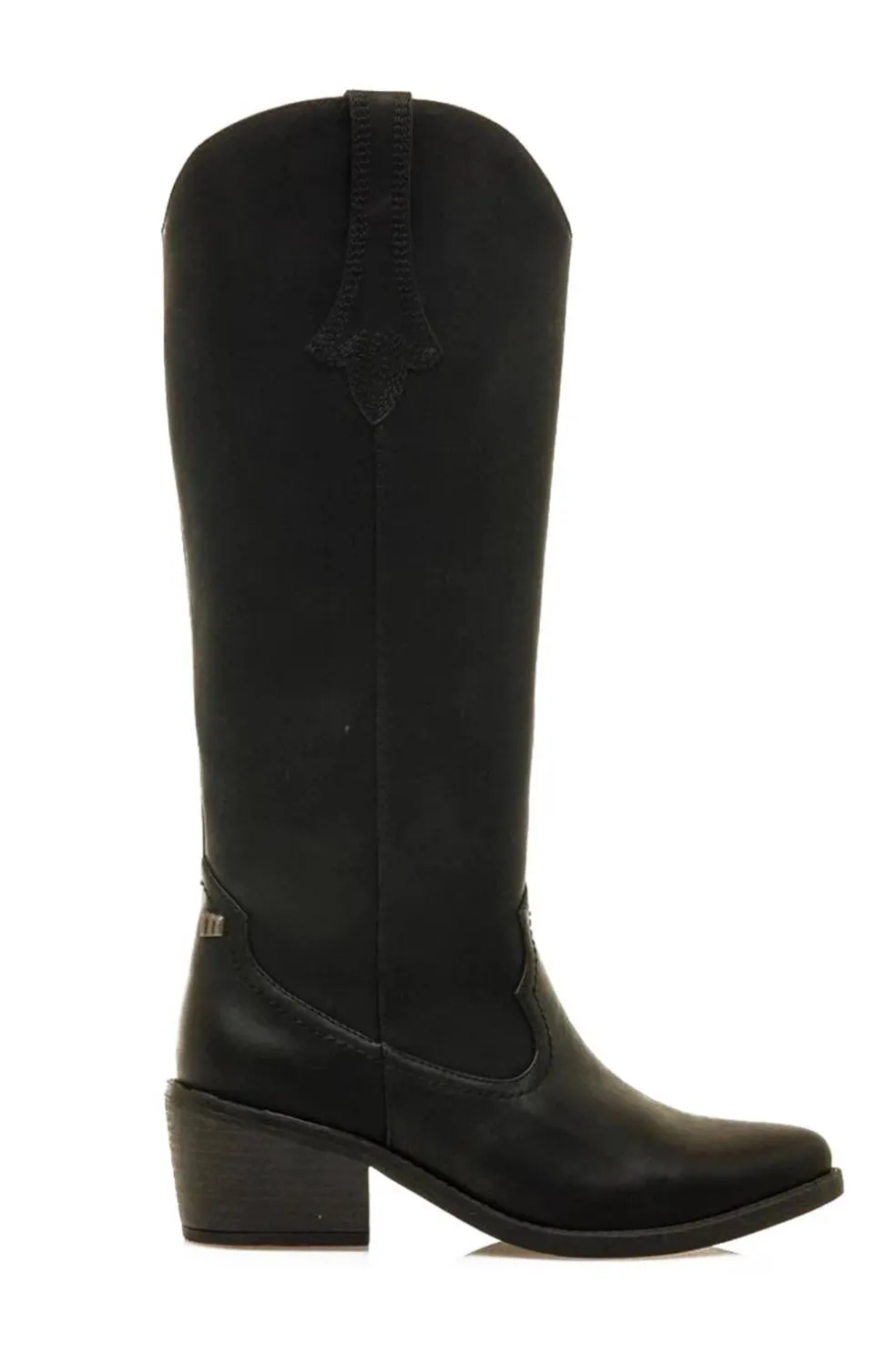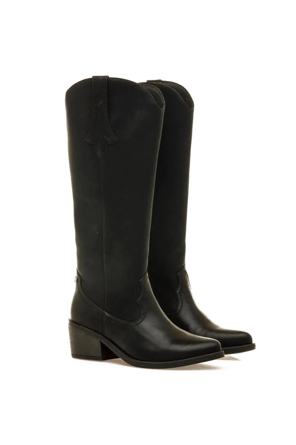 Bota alta Tanubis Mustang para mujer. Diseñada en color negro, destaca gracias a su cómodo tacón de altura media y horma en punta. Diseño western en la parte inferior de la caña. Incluye cierre de cremallera interior en el lateral de la bota. Le darán el toque extra de estilo a tus looks diarios.