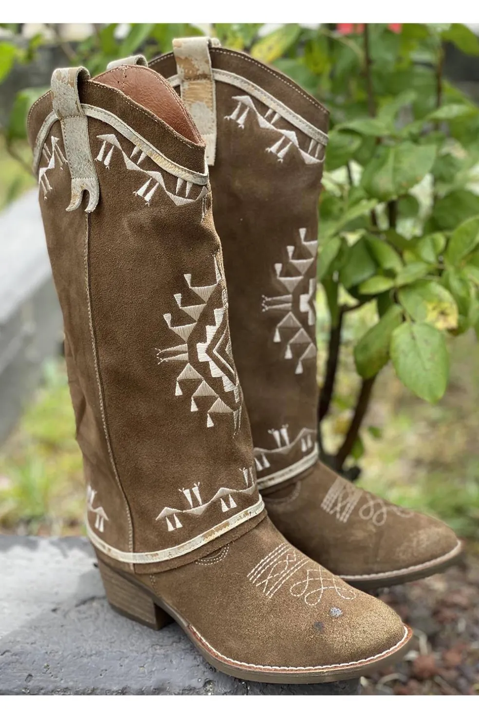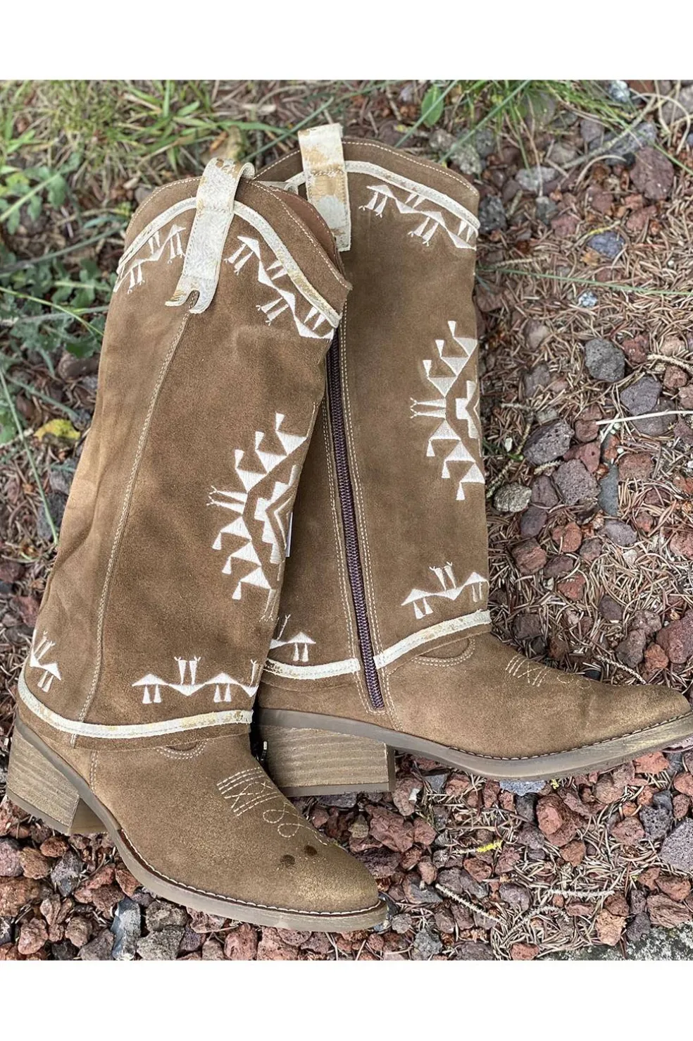 Disfruta de las últimas tendencias con las botas Nemonic 2378. Suela de goma. Detalles bordados sobre el fondo marrón serraje. Bonita chapa metálica en el tacón.
