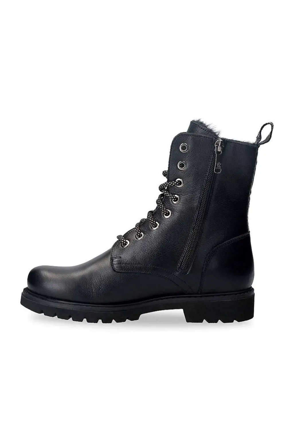 Bota Panama Jack de mujer plana. Con cierre de cremallera. Tiene piel Napa Negro WATERPROOF, con forro interior de Pelo Cálido, plantilla anatómica extraíble y suela de caucho natural, flexible y resistente. Hecho en España.
