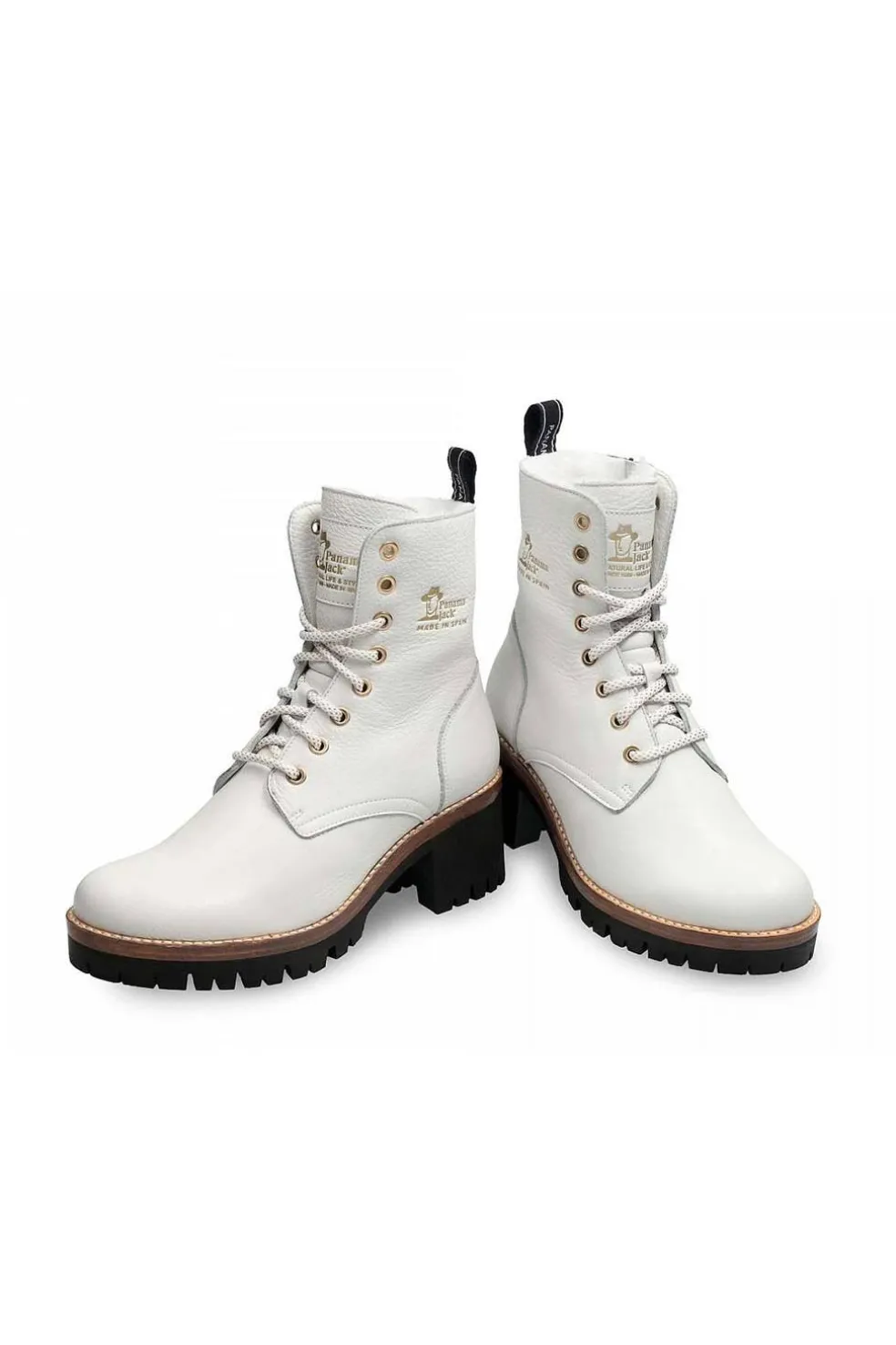 Bota Panama Jack de mujer con tacón de 6,5 cm y cierre de cremallera. Fabricada con piel napa blanco WATERPROOF, forro interior de pelo cálido y plantilla anatómica. Suela de tpu, flexible y resistente. Hecho en España.