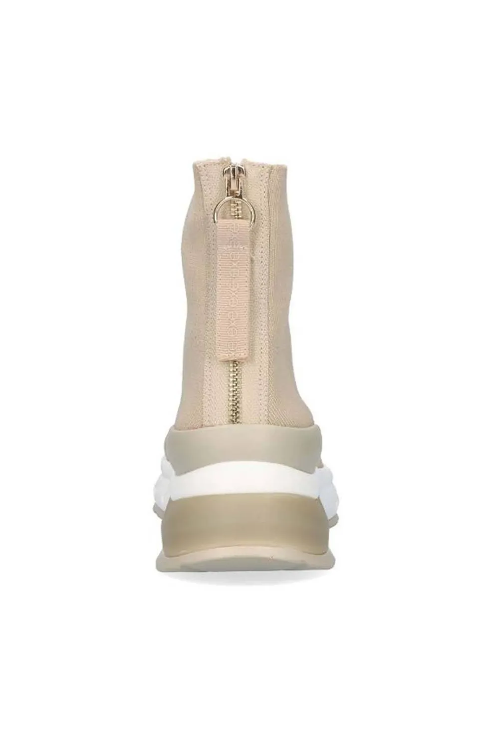 Sneaker botín estilo calcetín con detalle trasero con tira en la cremallera. Altura de la plataforma de 7 cm , plataforma delantera de 3 cm y altura de la caña de 19 cm. Compuesta por corte y planta textil y suela sintética.