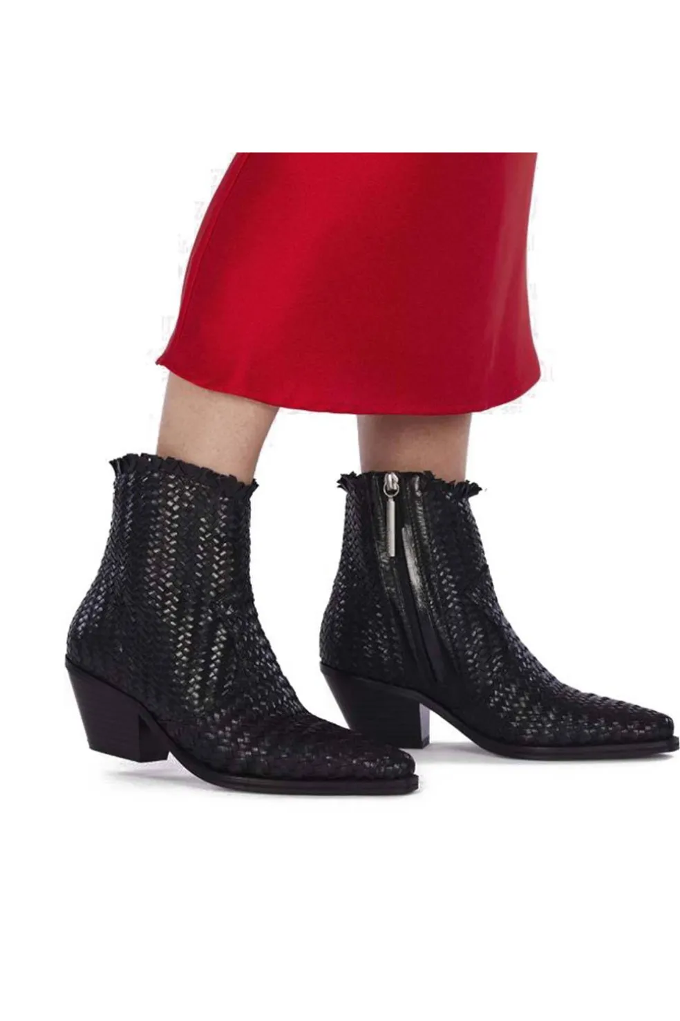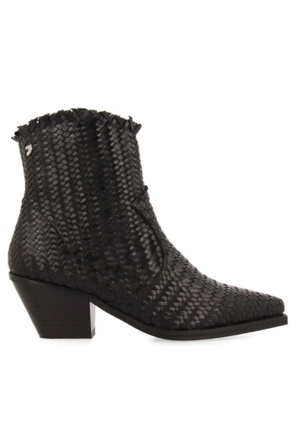 Botines estilo cowboy de piel trenzada en color negro y tacón medio. Planta con fibras naturales. Plantilla acolchada de látex y forro reciclado. Plantilla y forro de piel curtidos en tenerías que siguen un proceso de curtición más sostenible bajo los estándares de Leather Working Group.