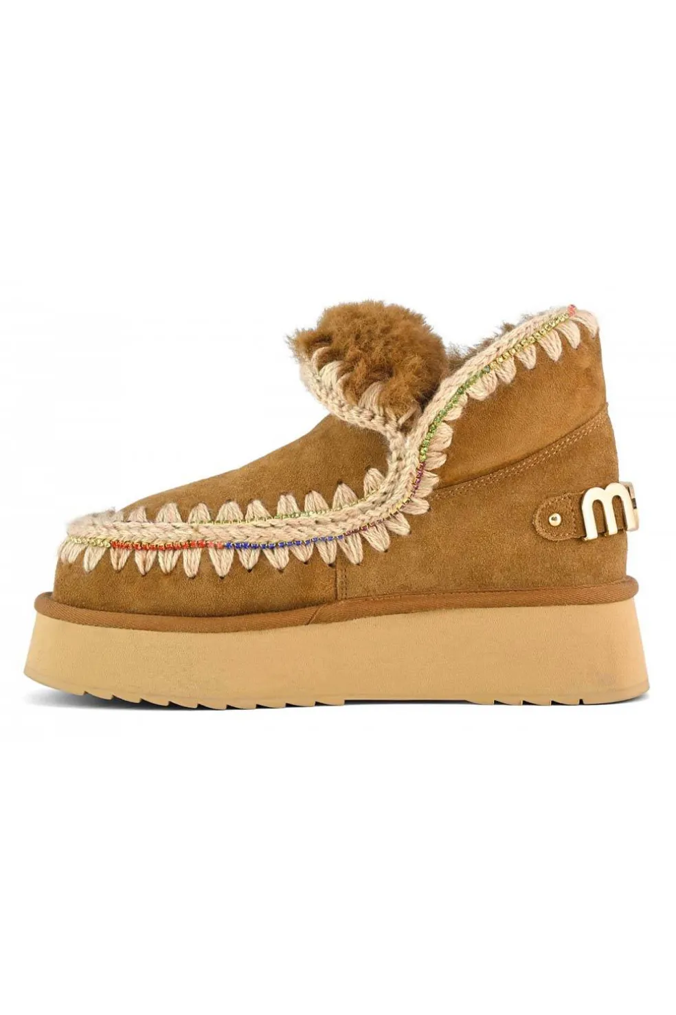 Novedad para la temporada Otoño-Invierno 24, la plataforma eskimo 18 con pedrería añaden toque de color. Realizadas a mano por artesanos expertos en lujoso ante con las características costuras de lana de la marca.