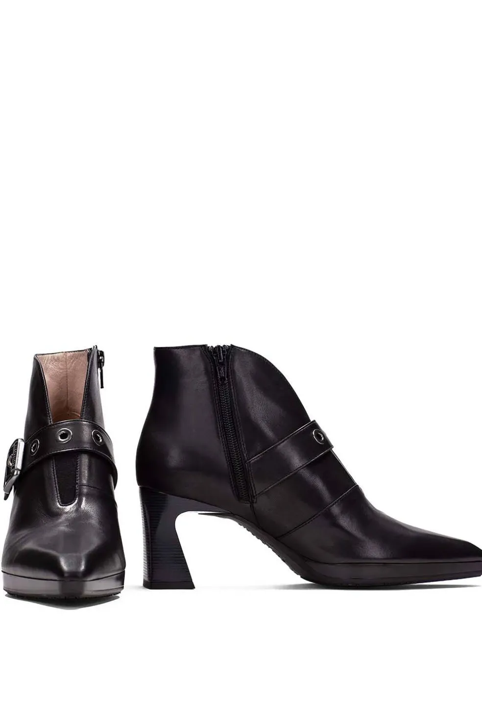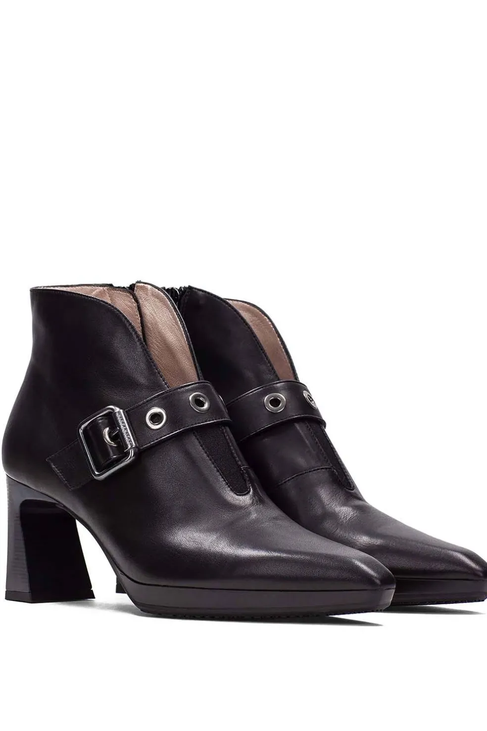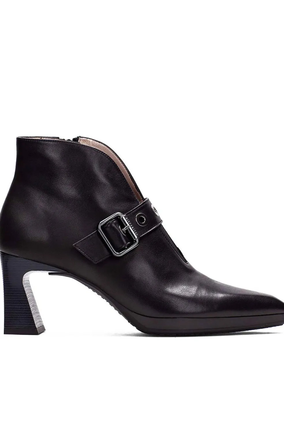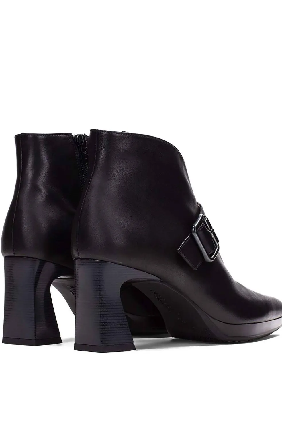 Botín de punta redonda con tacón bloque de 5 cm y combinación de materiales. Cierre de cremallera y adorno de hebilla en el lateral. Este modelo incorpora la tecnología Triflow.