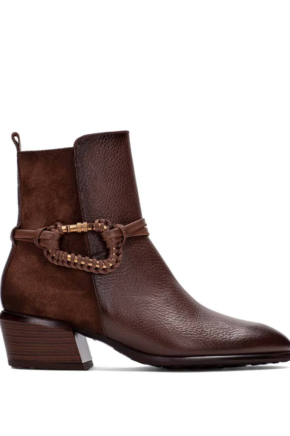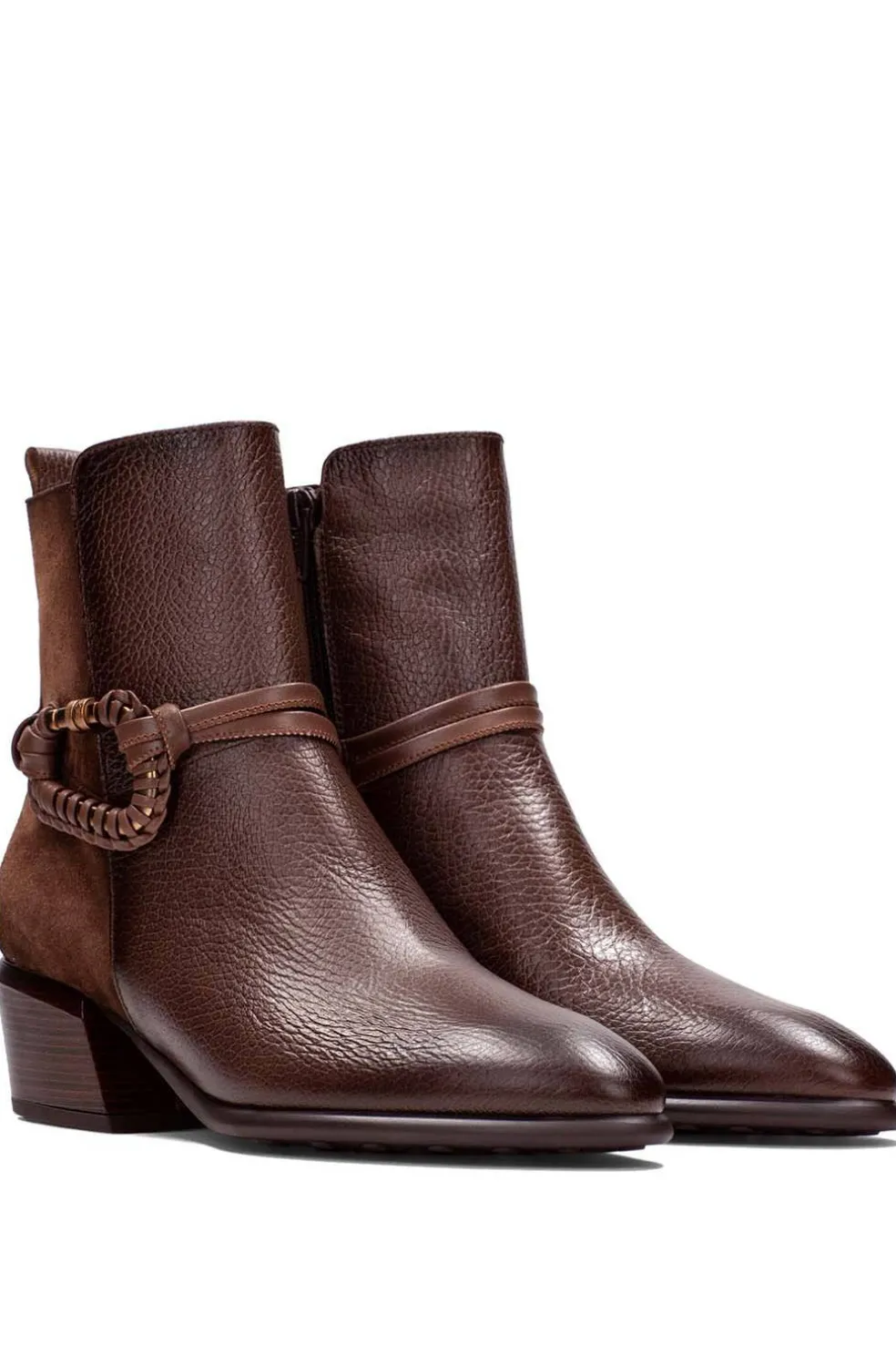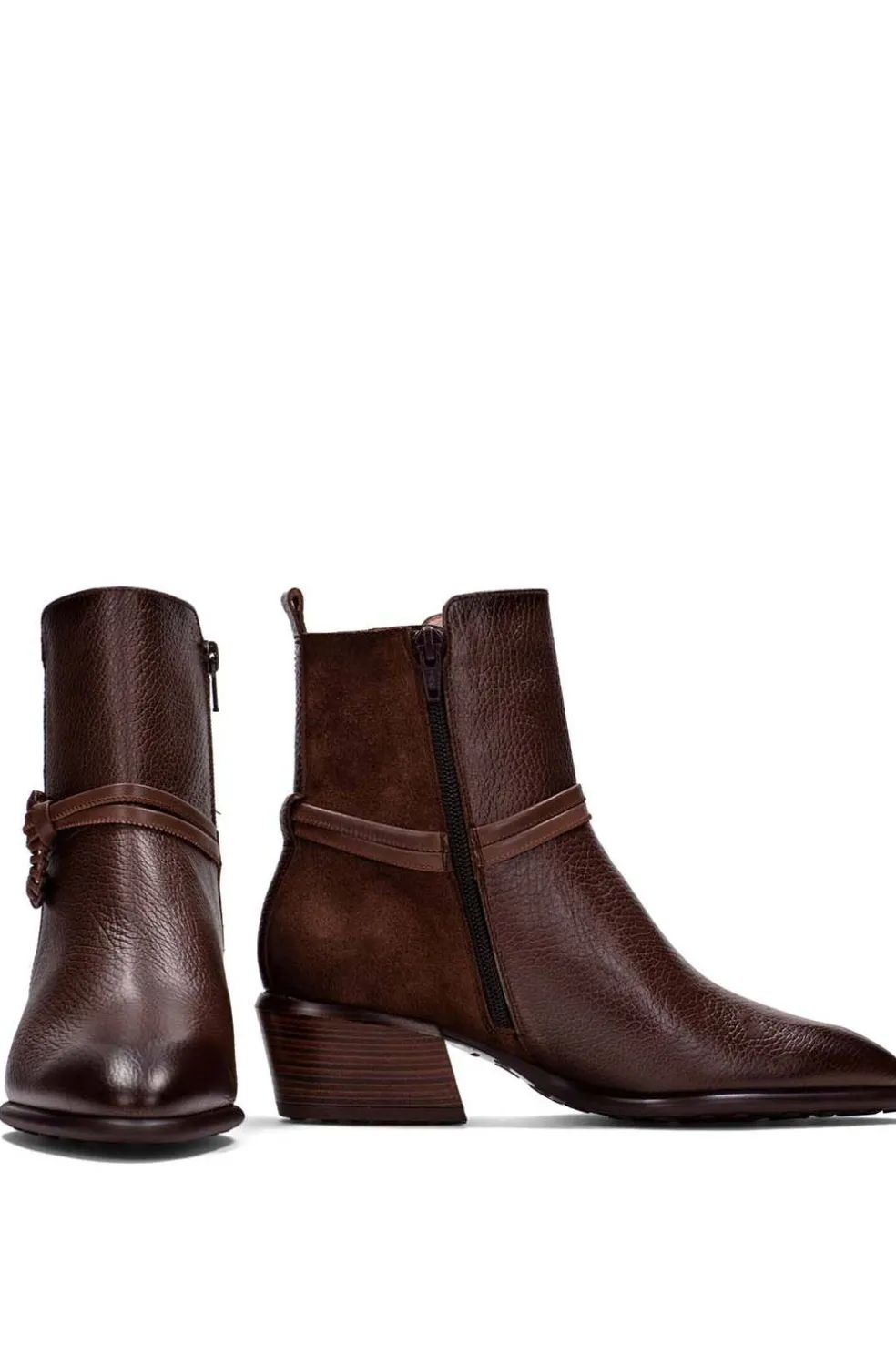 Botín con detalle de tiras y mosquetón forrado en piel sintética y cremallera lateral que facilita el calce. Cuenta con piso efecto goma con perfil de tacos y tacón cubano de 5 cm con acabado madera. Elaborado en piel, con forro interior de origen no animal, 100% transpirable y termorregulador, e incorpora tecnología Triflow para una pisada acolchada y cómoda. Altura del tacón: 4 cm.
