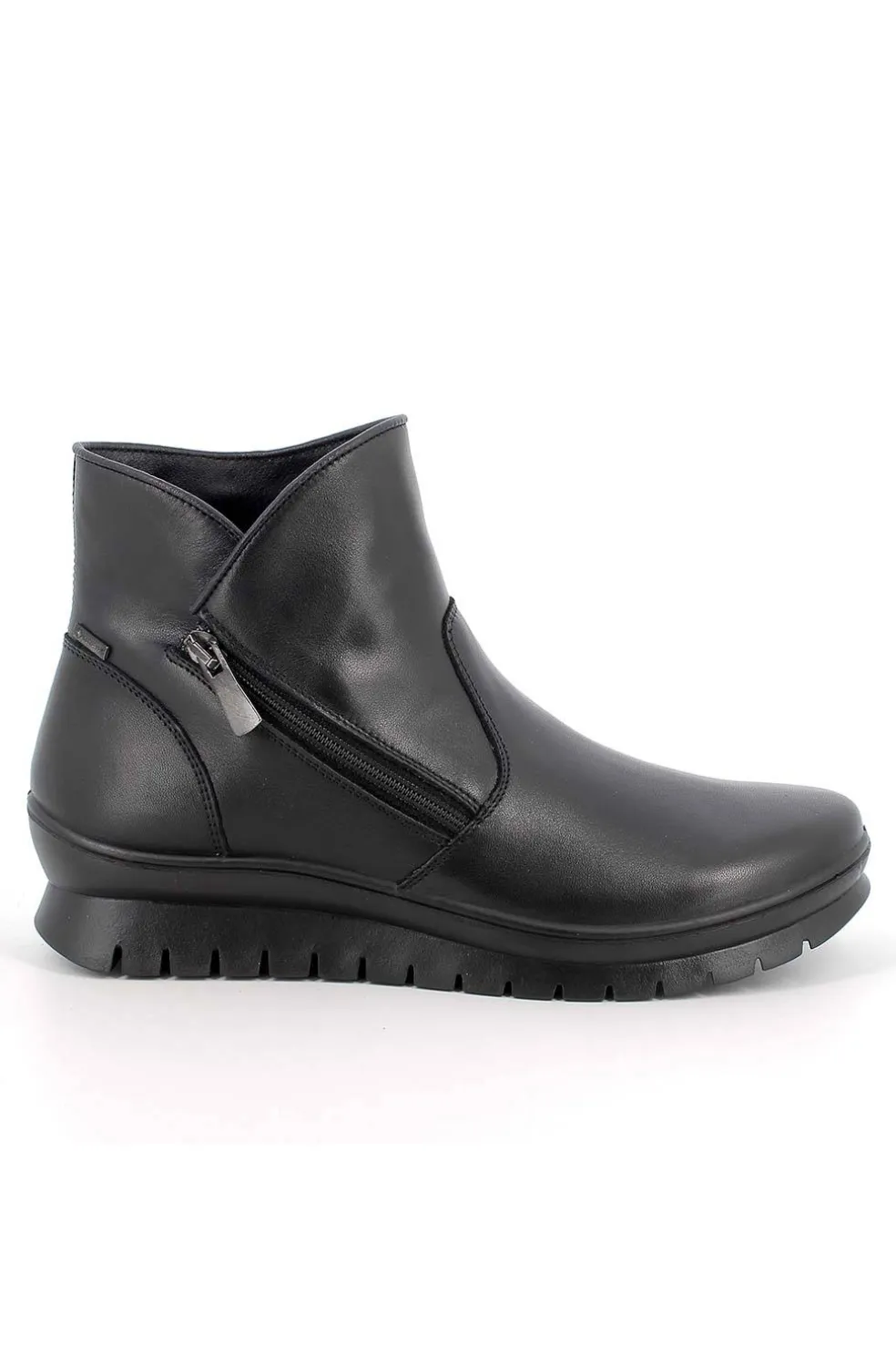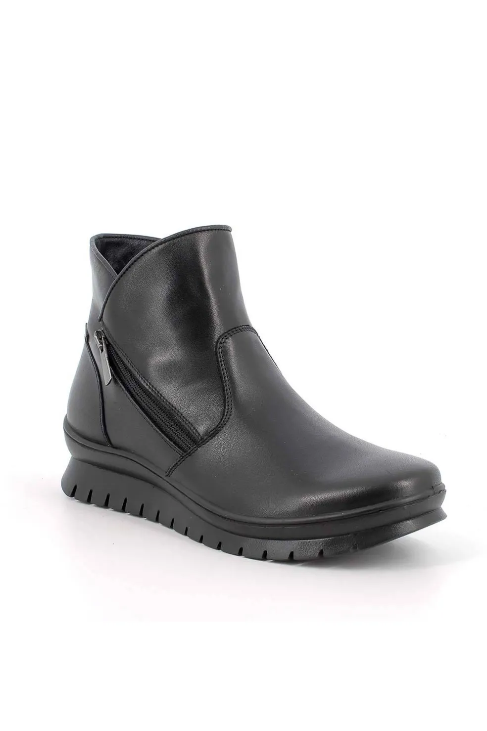 El diseño de este botín de piel no pasa desapercibido. La cremallera exterior en posición oblicua le da personalidad y es funcional al mismo tiempo.
