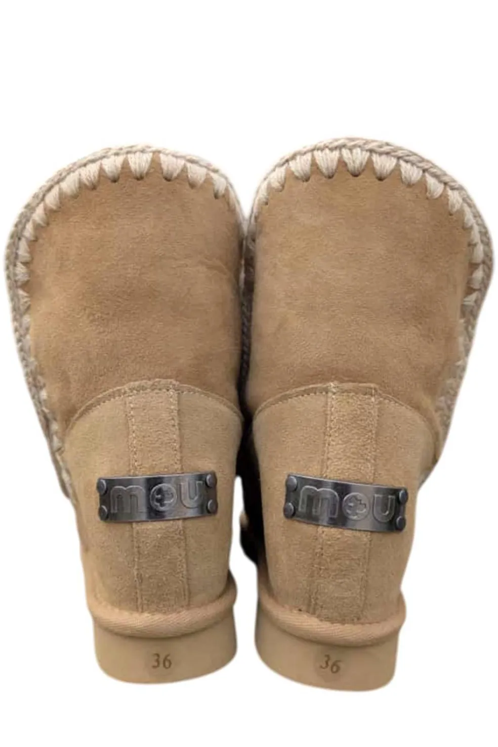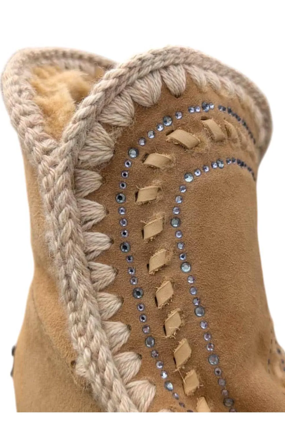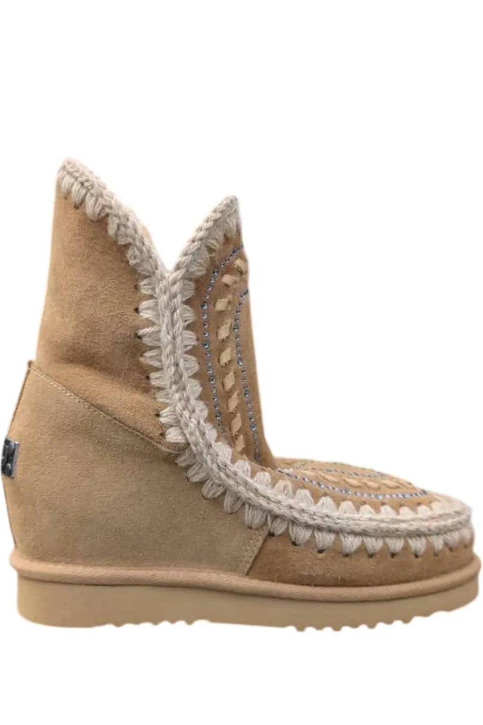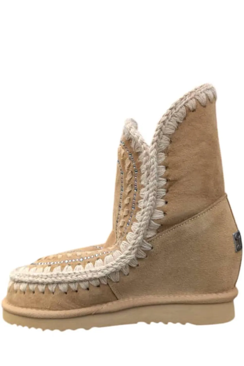Novedad para esta temporada, eskimo inner wedge short y detalles de strass. Este modelo, con tacón oculto de 5 cm y una silueta más esbelta, es increíblemente favorecedor y está elaborado a mano con auténtica piel de oveja de doble cara, las características costuras de lana de la marca mou cosidas a mano, un soporte de apoyo para el talón y una resistente suela de EVA,