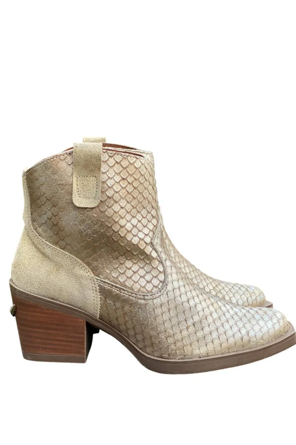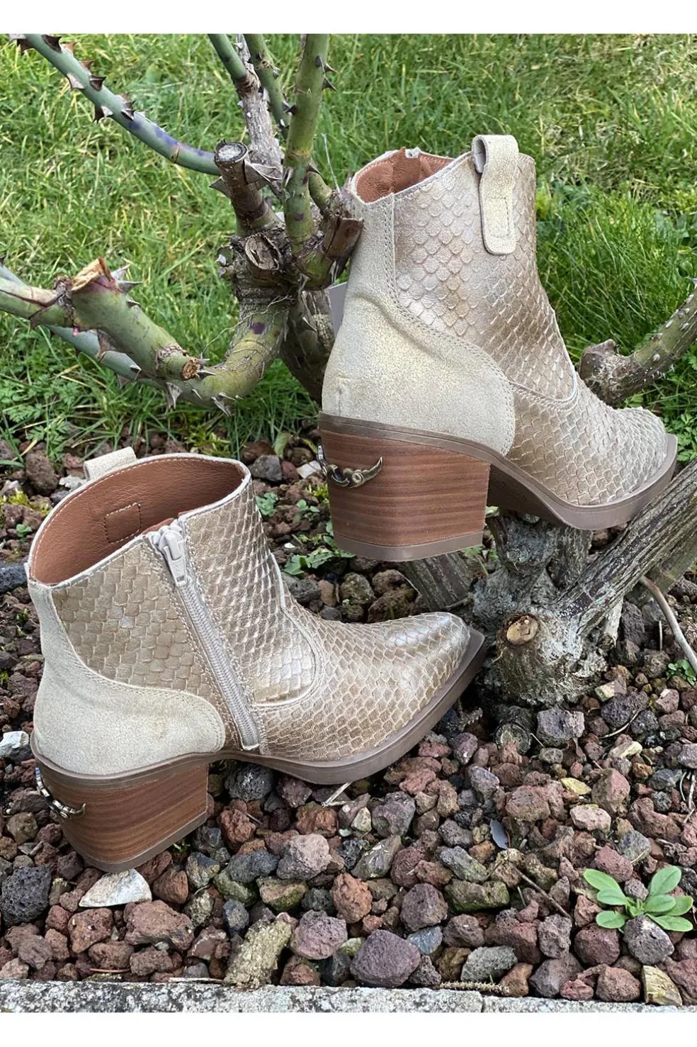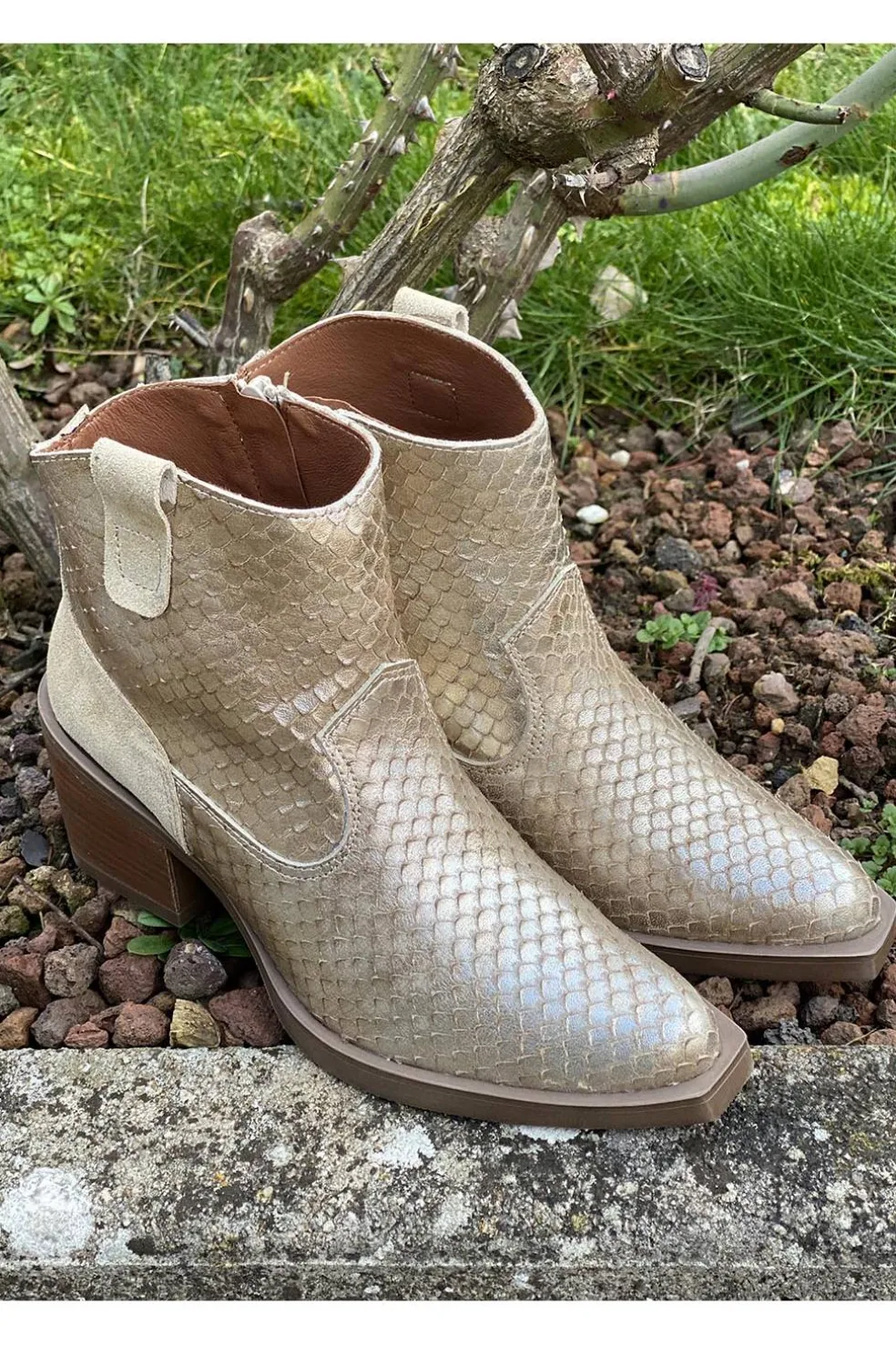 Conoce el nuevo botín 2413 de la marca Nemomic. Su elegante efecto serpiente brillante dorado lo convierte en una pieza única y moderna. La cremallera lateral permite ponérselo con facilidad, mientras que el tacón cuadrado de 7 cm proporciona una altura cómoda y segura. El contraste de piel lisa en el tacón añade un detalle especial, y su punta fina realza su estilo chic y contemporáneo. Ideal para cualquier ocasión, este botín es un complemento esencial para tu colección de calzado.