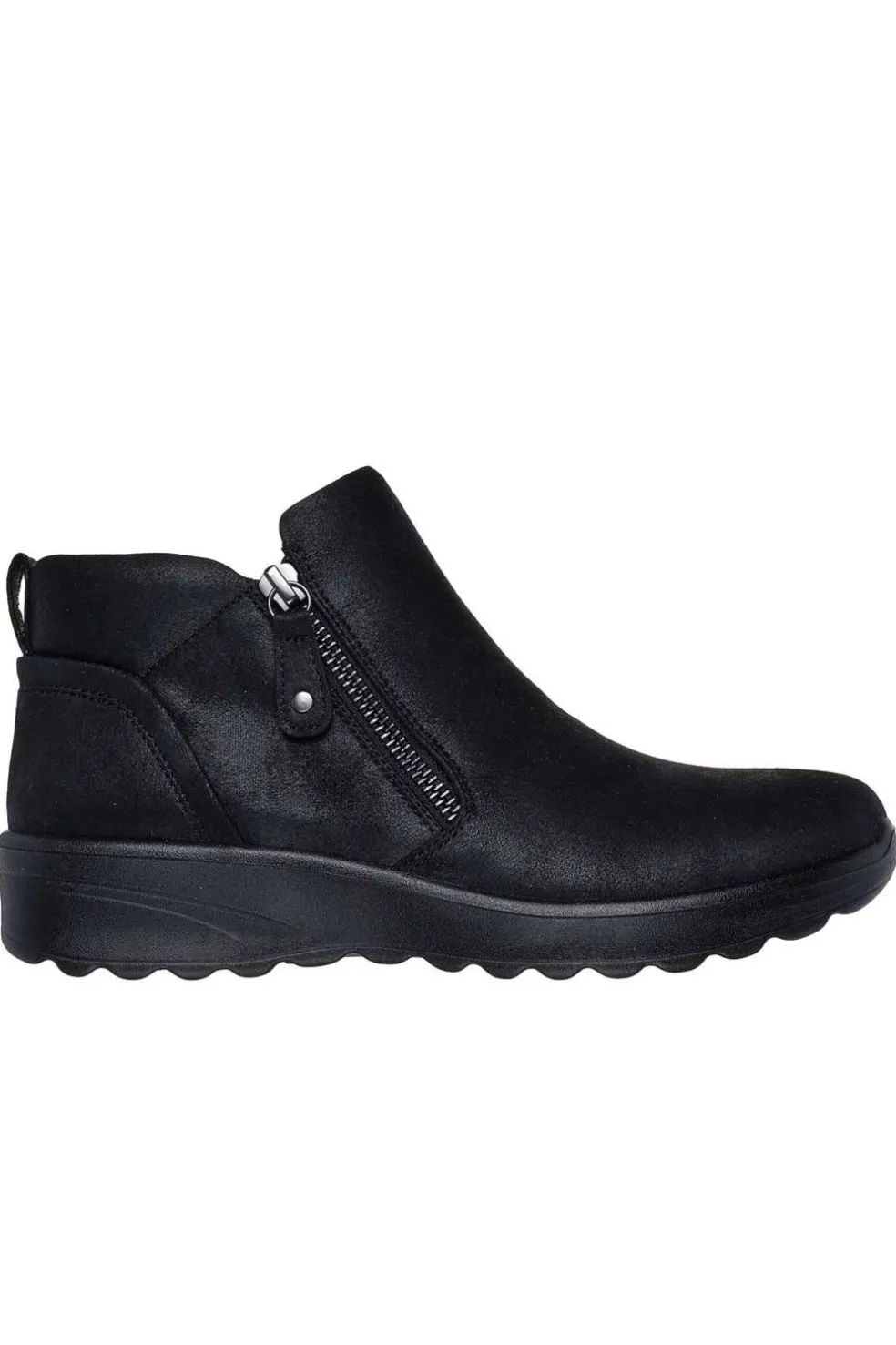 Muévete con toda la comodidad y un estilo moderno con Skechers Lovely Vibe – Fall In Bloom. Botín a la altura del tobillo con parte superior de piel vegana, cierre de cremallera lateral y plantilla Skechers Air-Cooled Memory Foam® con amortiguación.