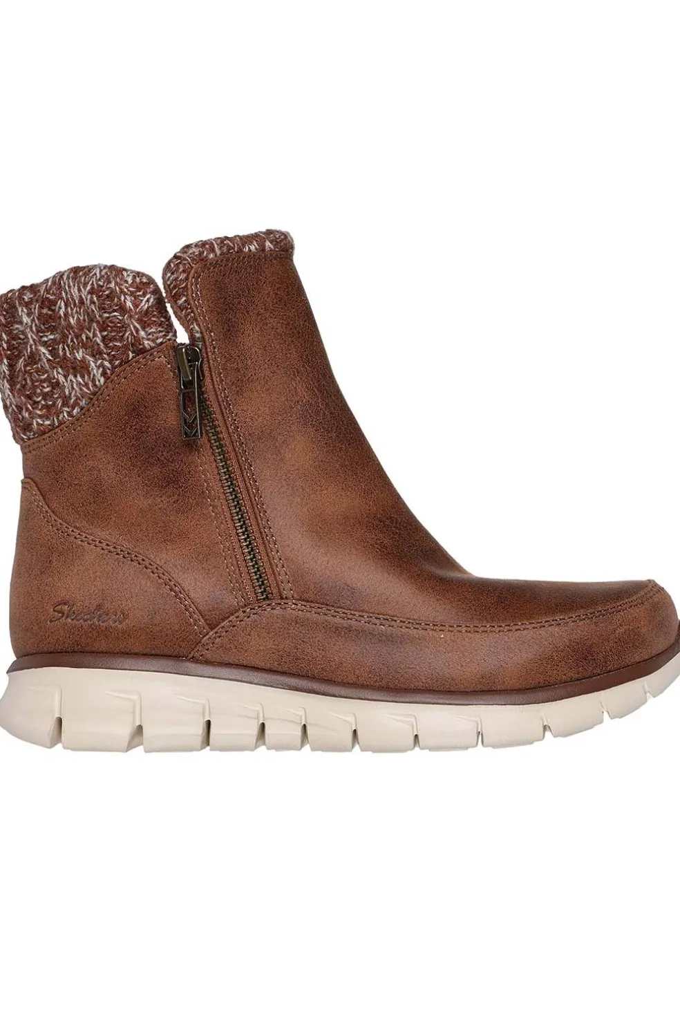 Abrígate bien esta temporada con Skechers Synergy – Lovely Collab. Esta bota con cremallera cuenta con una parte superior de piel vegana tratada con 3M® Scotchgard® con ribete de knit de punto brillante, plantilla Warm Tech Memory Foam y una suela con tracción antideslizante.