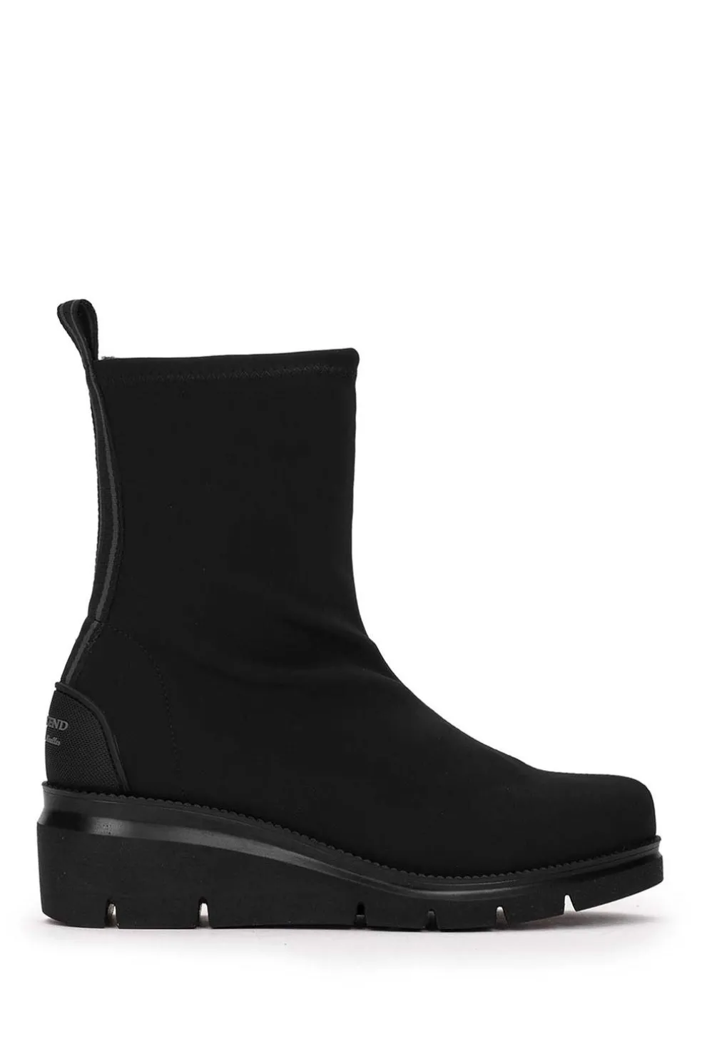 Botines de tejido elástico efecto ante de color negro. Los botines con plataforma de ante elástico combinan elegancia y comodidad. Una opción moderna y chic para aportar un toque casual a tus outfits.