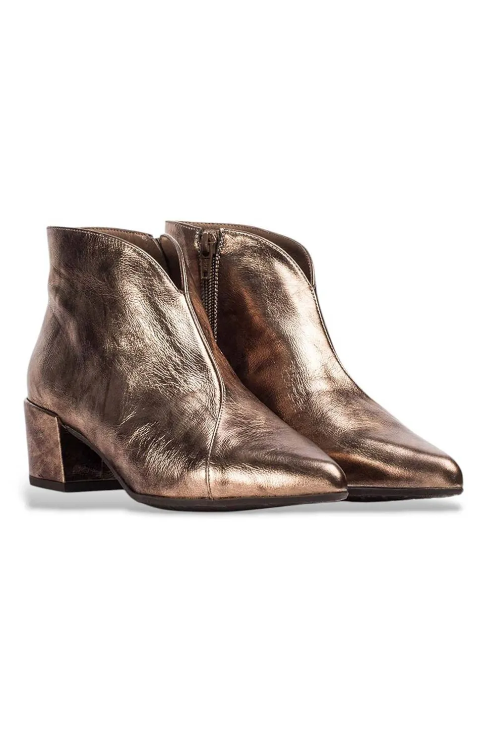Botines RUBIN fabricados en piel en tono bronce. Diseño único y elegante con corte en forma de “V”, puntera afilada y cierre mediante cremallera lateral. Su tacón cuadrado forrado y su suela flexible aportan un extra de comodidad, combinado con la plantilla interior de MemoryGel que asegura una pisada amortiguada en cada paso.