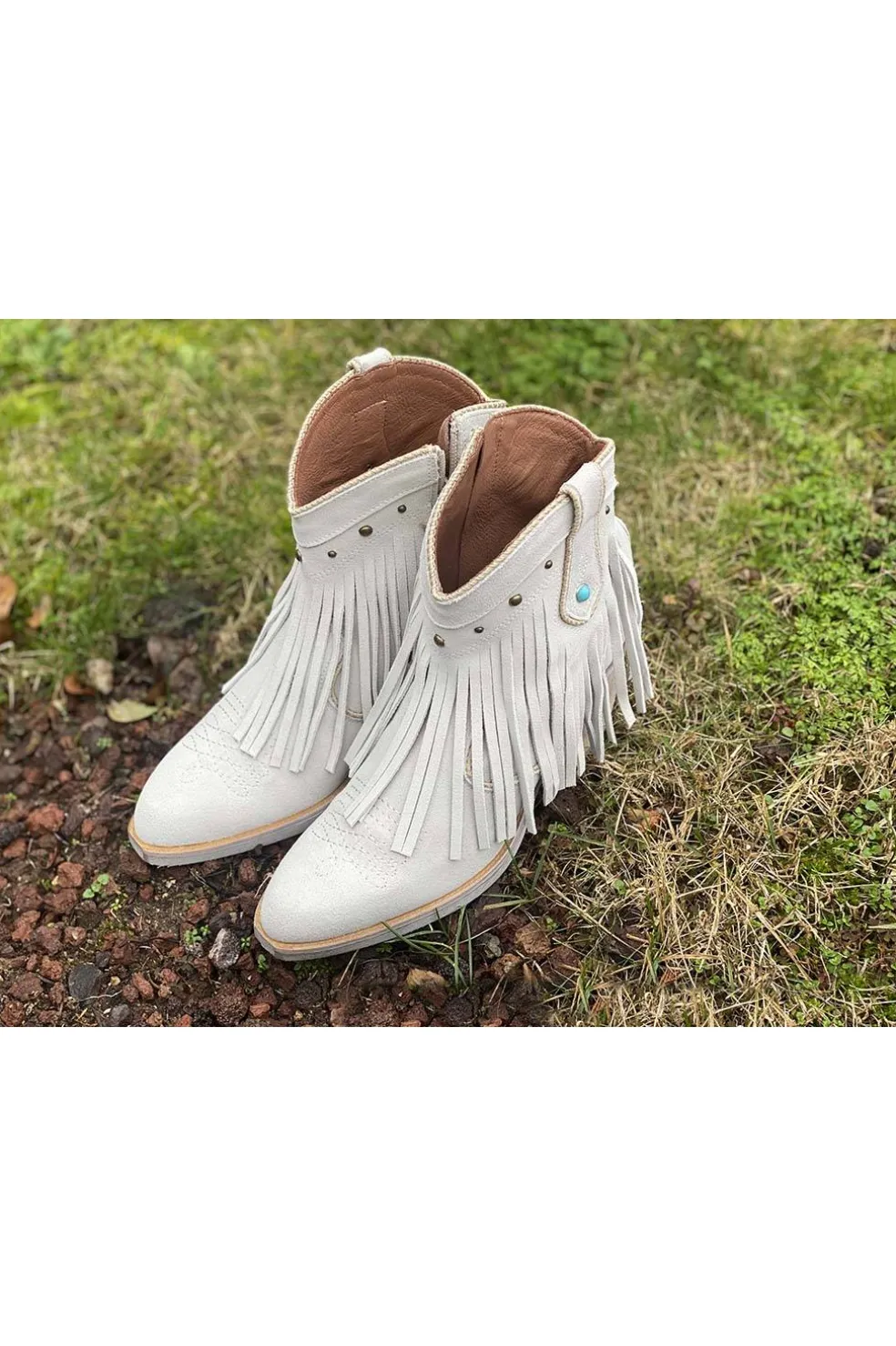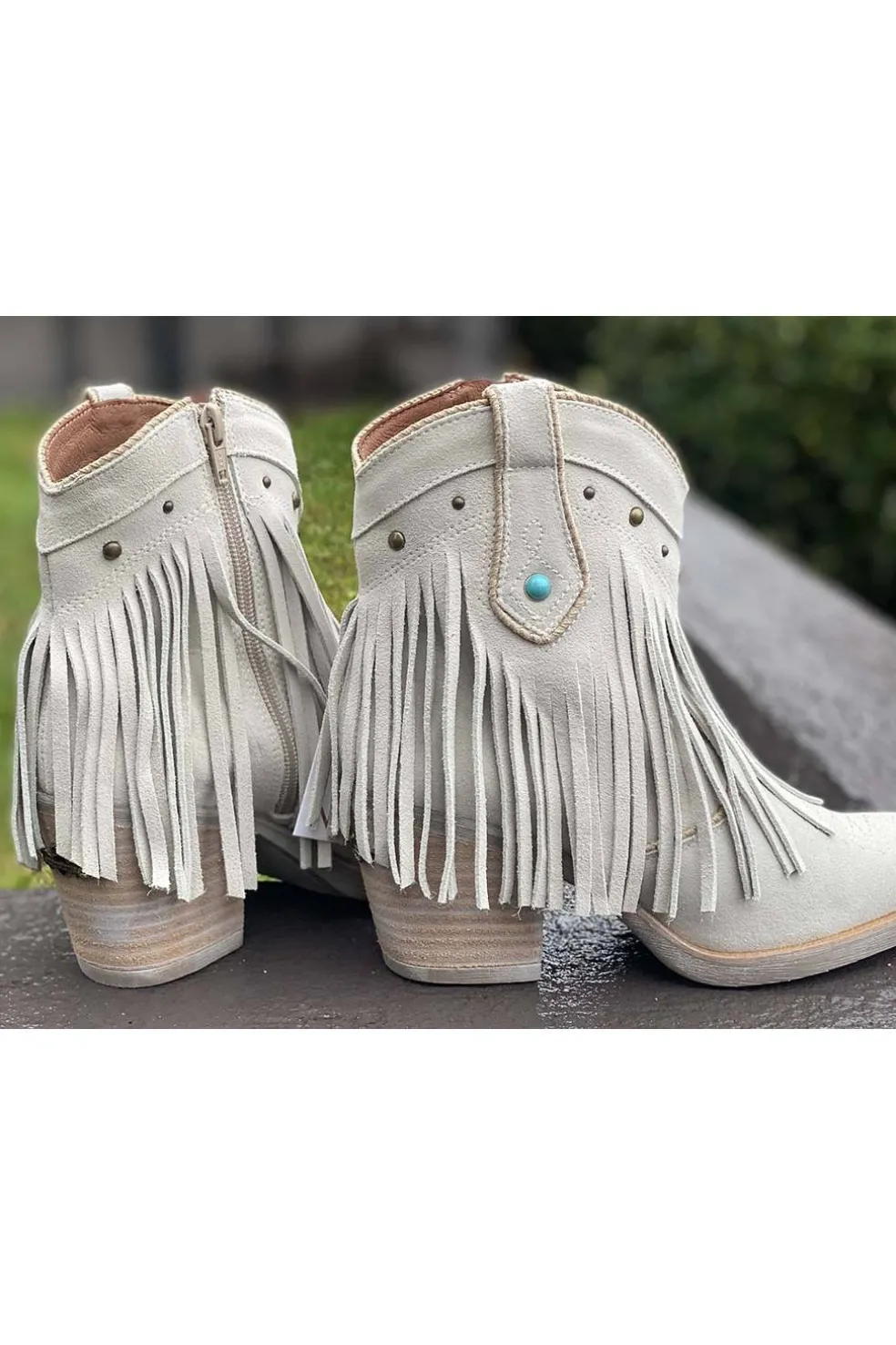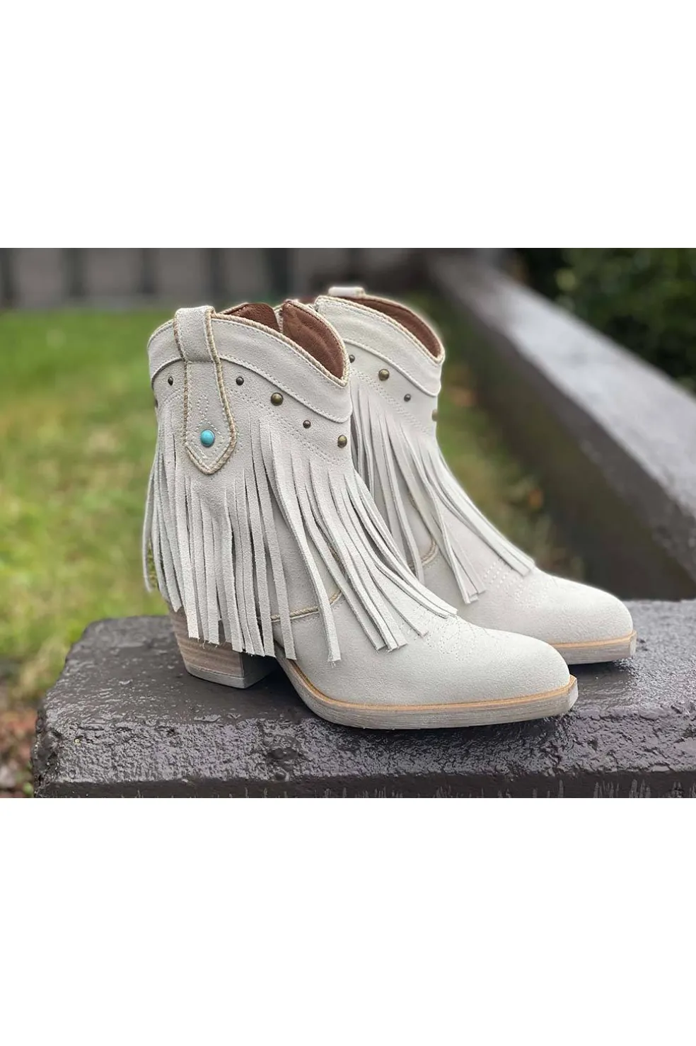 Espectacular botín campero en serraje con flecos, una pieza única que te hara ser el centro de todas las miradas. Bonita chapa metálica en el tacón. ESTA HORMA CAMPERA DA TALLA POR LO QUE RECOMENDAMOS UN NÚMERO MENOR. Tacón de 8 cm.