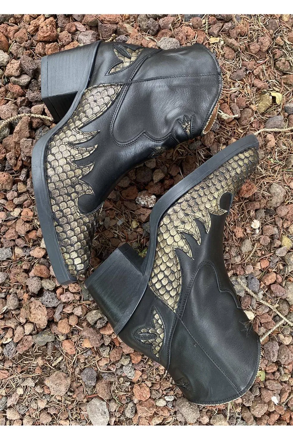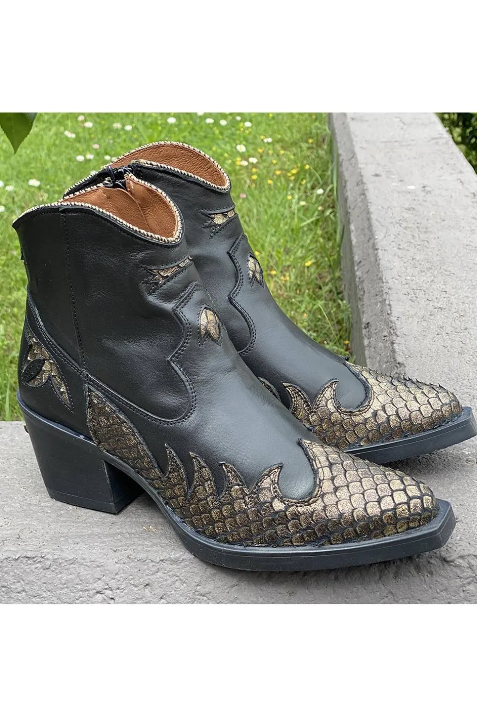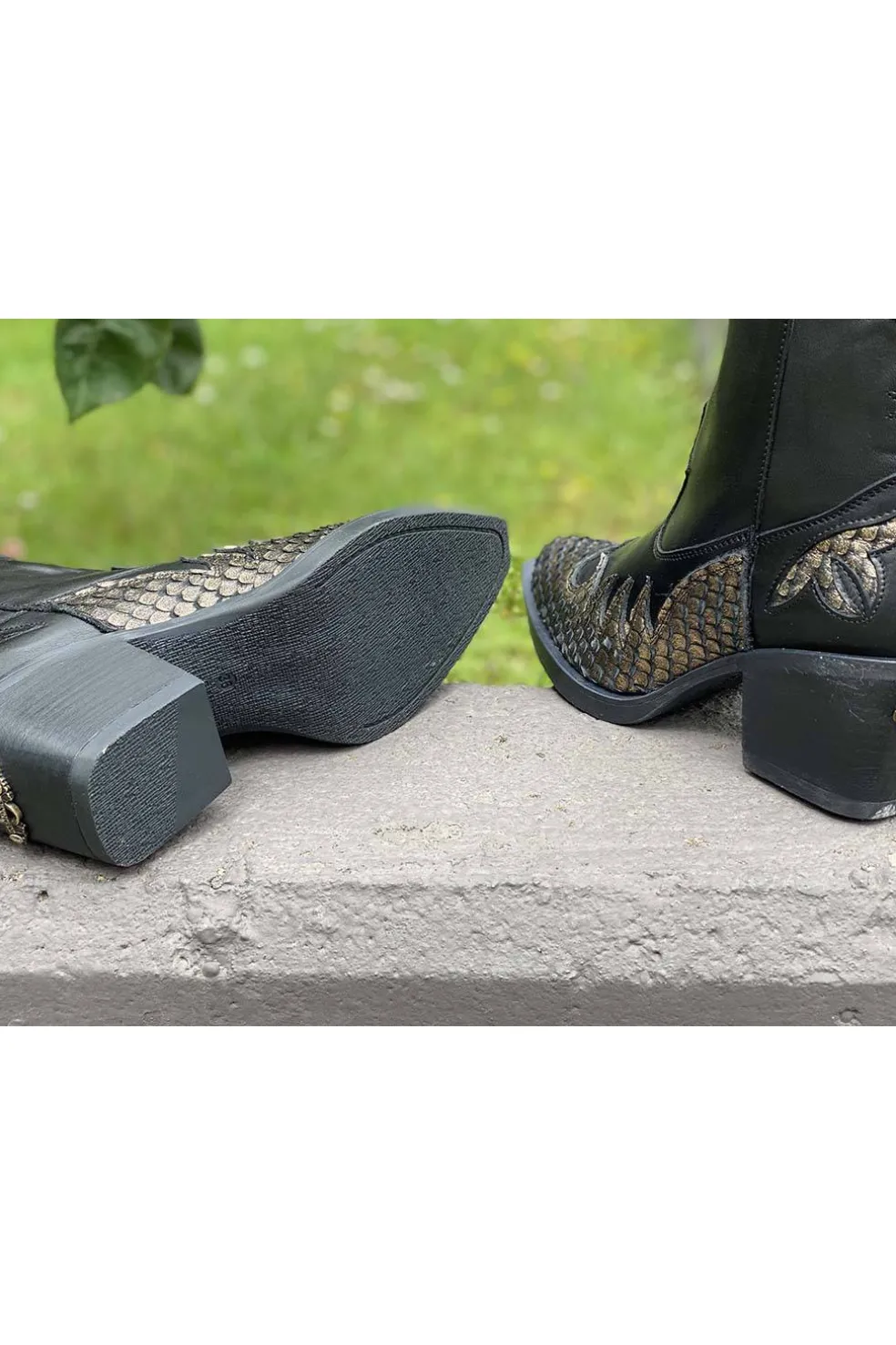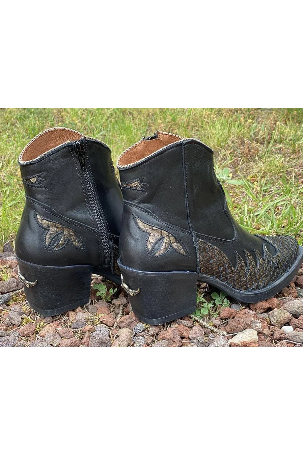 Botín de mujer en color negro con detalles serpiente en la puntera. Bonita chapa metálica en el tacón. Tacón de 6.5 cm. Altura caña desde el suelo 18.5 cm. Fabricación Nacional. Es una horma que talla un poco amplio , consultar.
