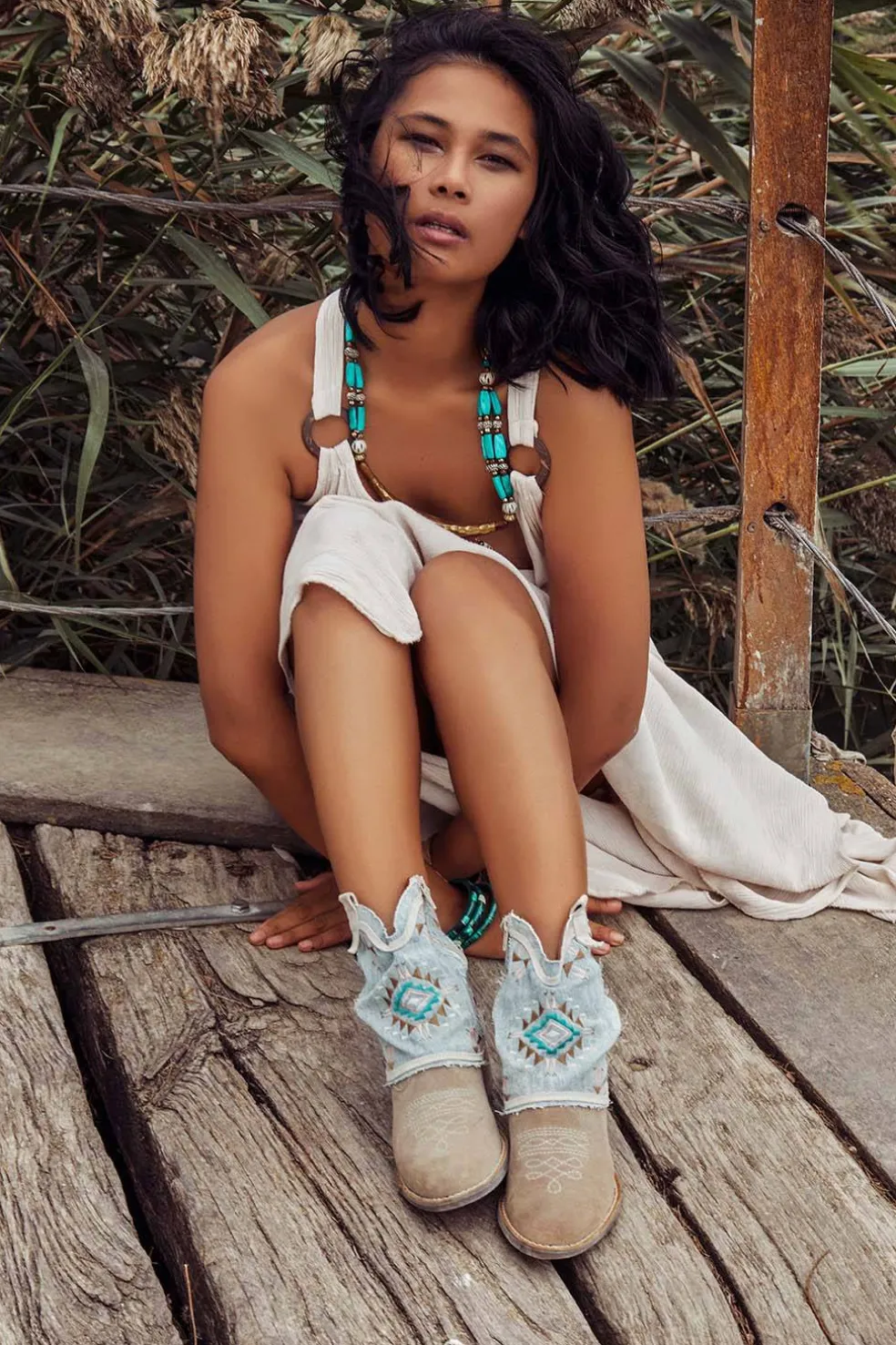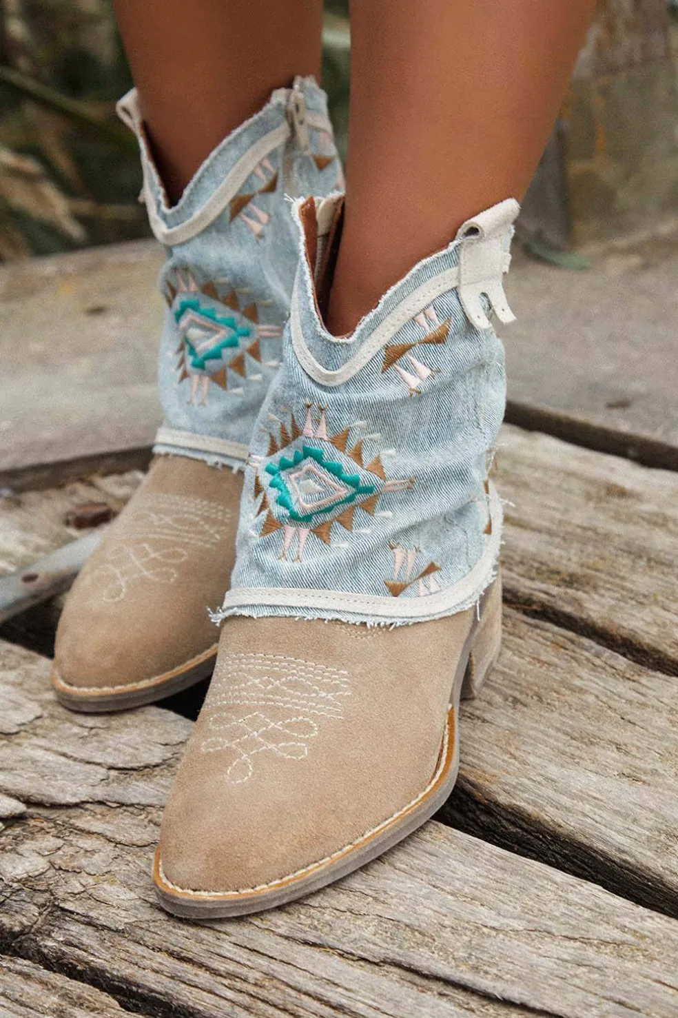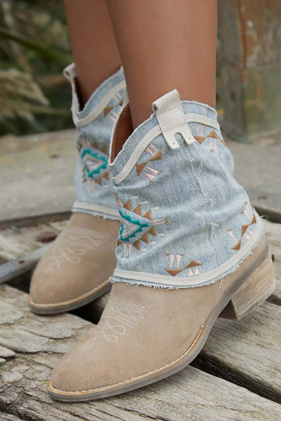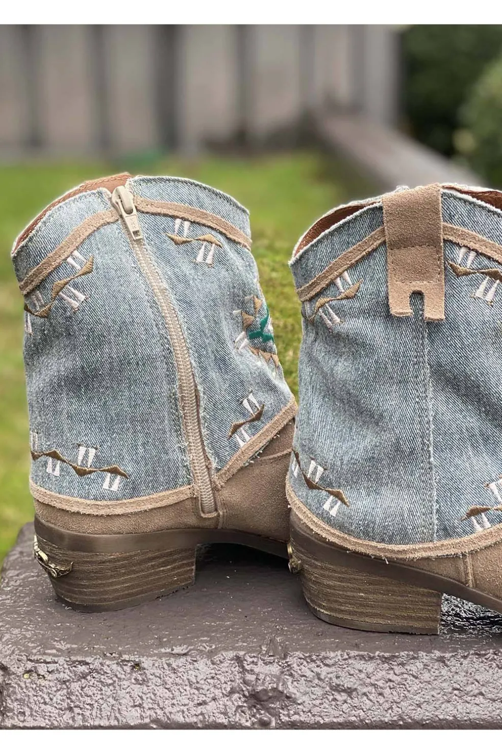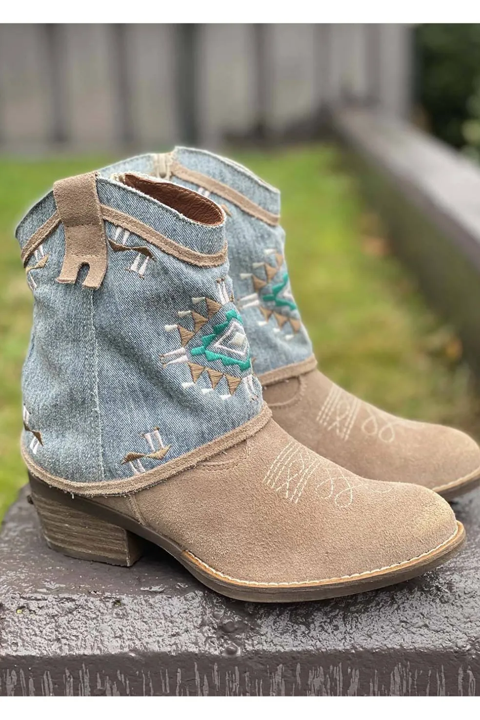 Botín de mujer con efecto tela vaquera con de puntera ante en color taupe. Detalles bordados sobre fondo vaquero. Bonita chapa metálica en el tacón. Fabricación Nacional.