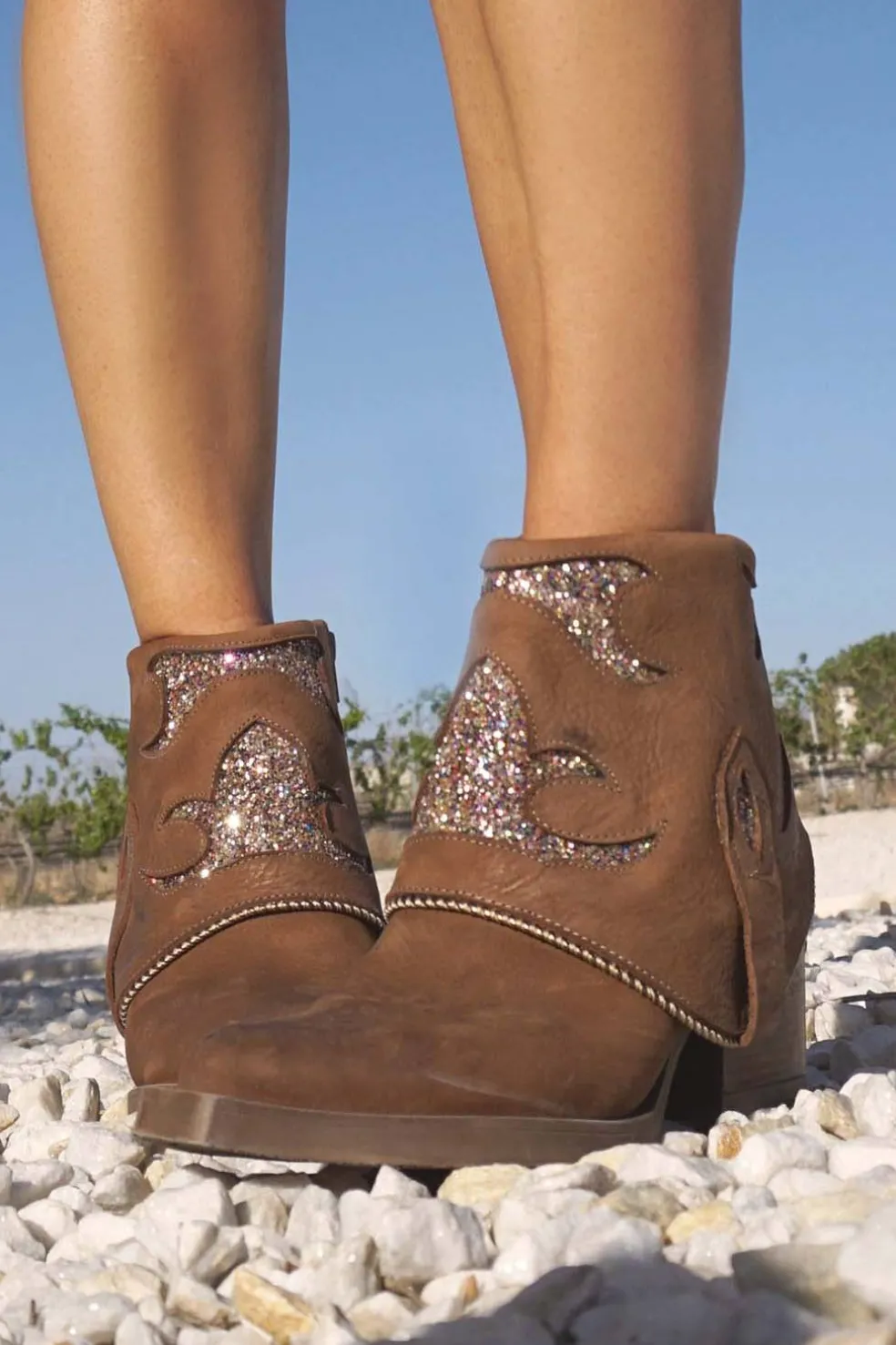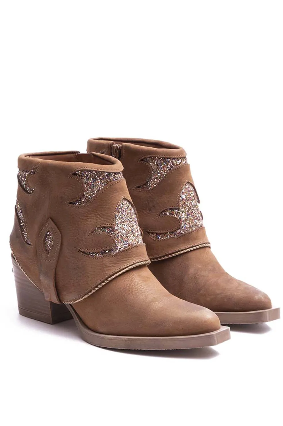 Botín de mujer de piel con color marrón. Detalles con purpurinasobre fondo. Bonita chapa metálica en el tacón. Fabricación Nacional.