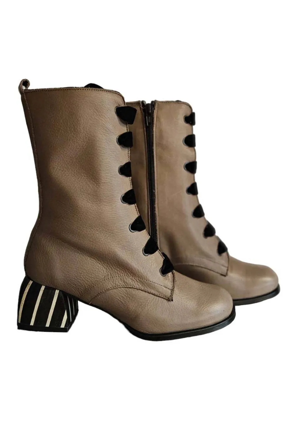 Botín de mujer de piel, en color taupe, con un aire retro. Con un tacón de 5 cm. Altura caña desde el suelo 25 cm. Fabricación Nacional.