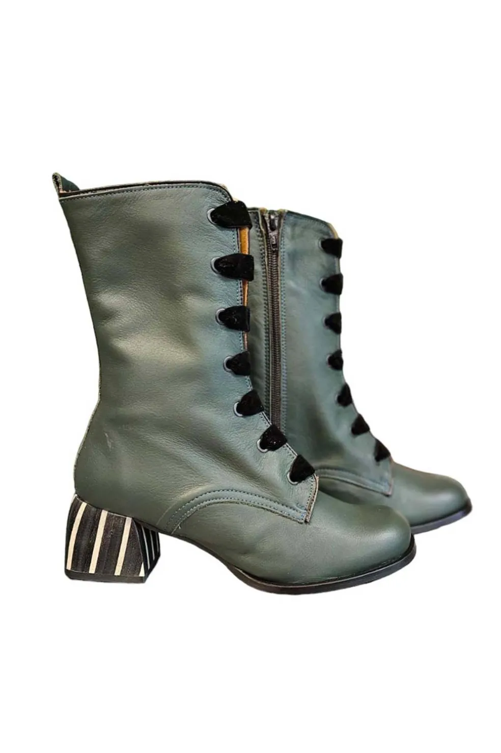 Botín de mujer de piel, en color verde, con un aire retro. Con un tacón de 5 cm. Altura caña desde el suelo 25 cm. Fabricación Nacional.
