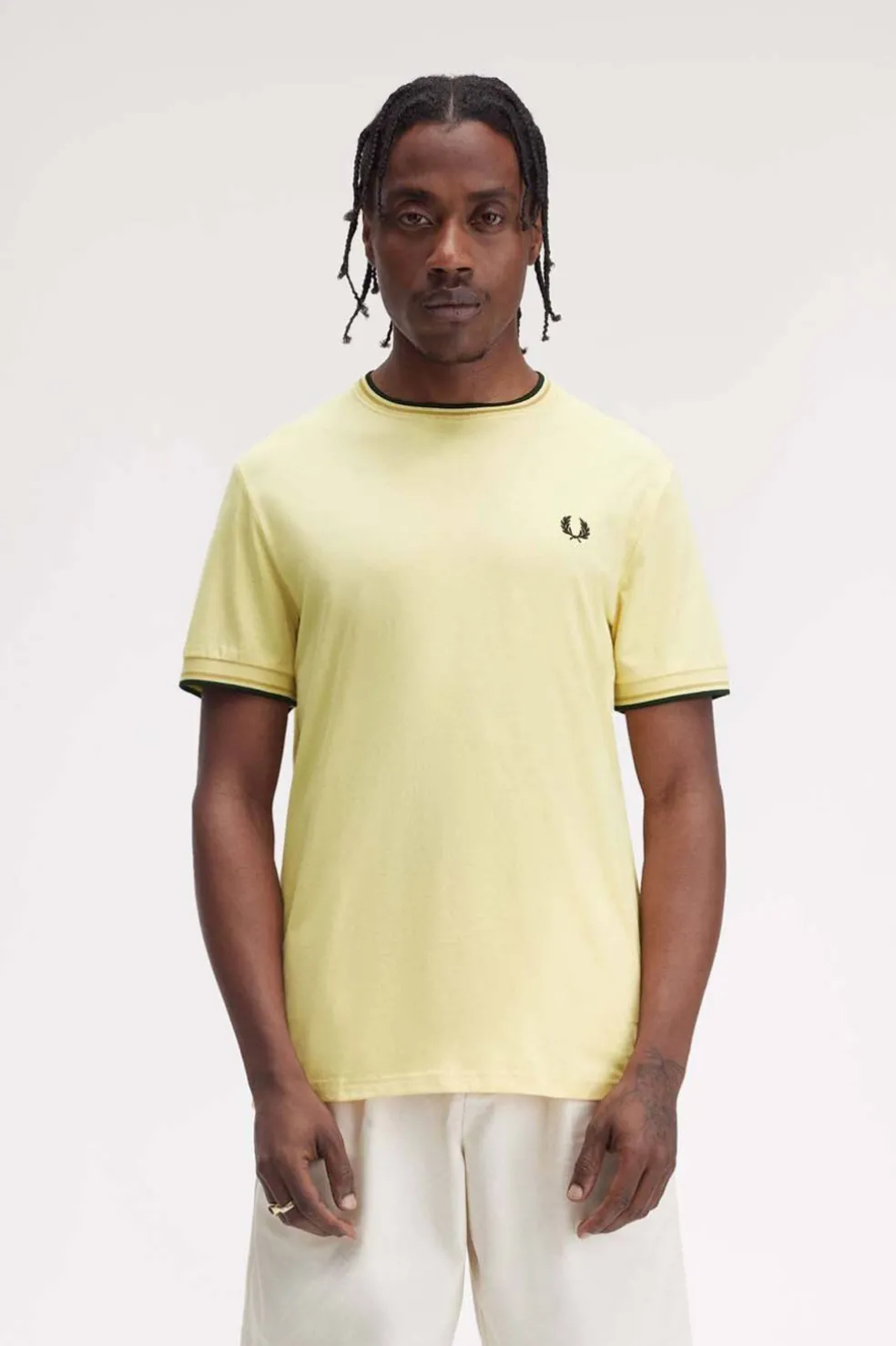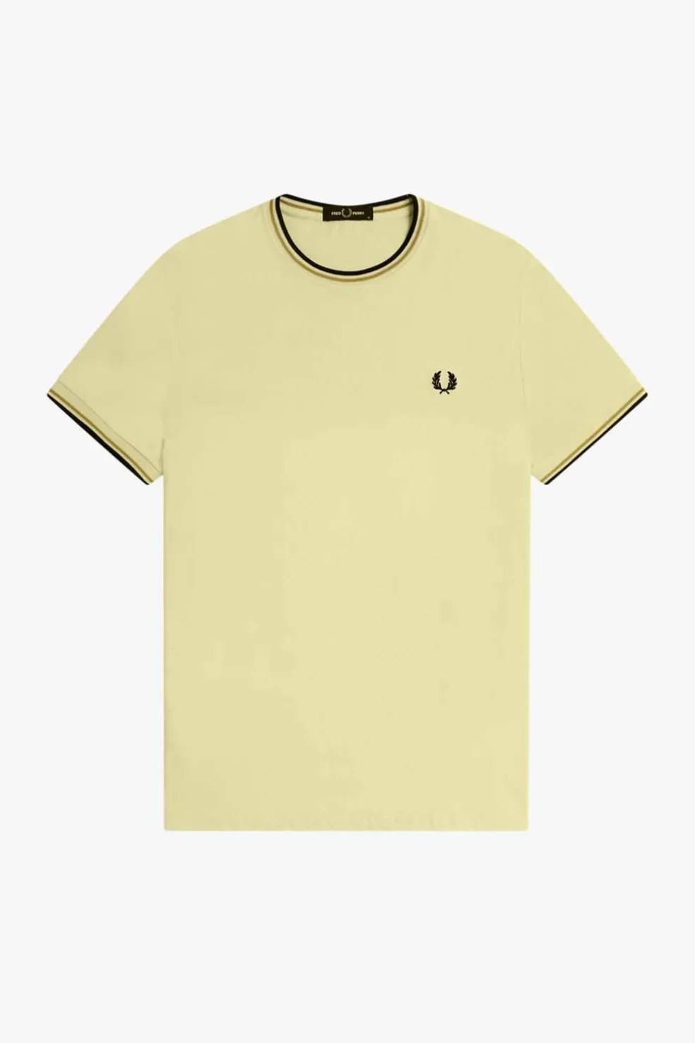 Cuenta la leyenda que un cliente de Lillywhites pidió personalizar un polo liso de Fred Perry con los colores de su equipo de fútbol y así nació nuestro ribete con dos franjas. Este elemento forma parte de nuestro ADN, ya que solo nosotros lo usamos en la proporción de grosor 5-4-4. Nuestra camiseta de cuello redondo, diseñada con nuestros inconfundibles detalles, presenta el ribete con dos franjas y la corona de laurel bordada en un color a juego. Absolutamente Fred Perry.