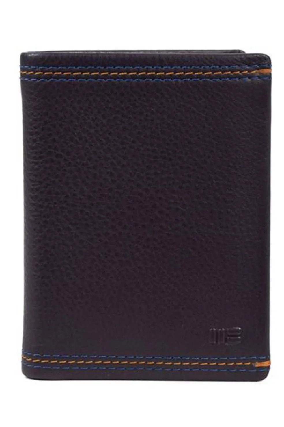Cartera de piel de vacuno. Doble bolsillo para billetes. Ventana para documentación y seis ranuras para tarjetas. Diseño exterior con pespuntes en azul marino y gris. Identificación del logotipo de la marca grabado a fuego en alto relieve. Esta pieza está protegida con sistema de bloqueo RFID para evitar el escaneo, lectura y pagos no autorizados.