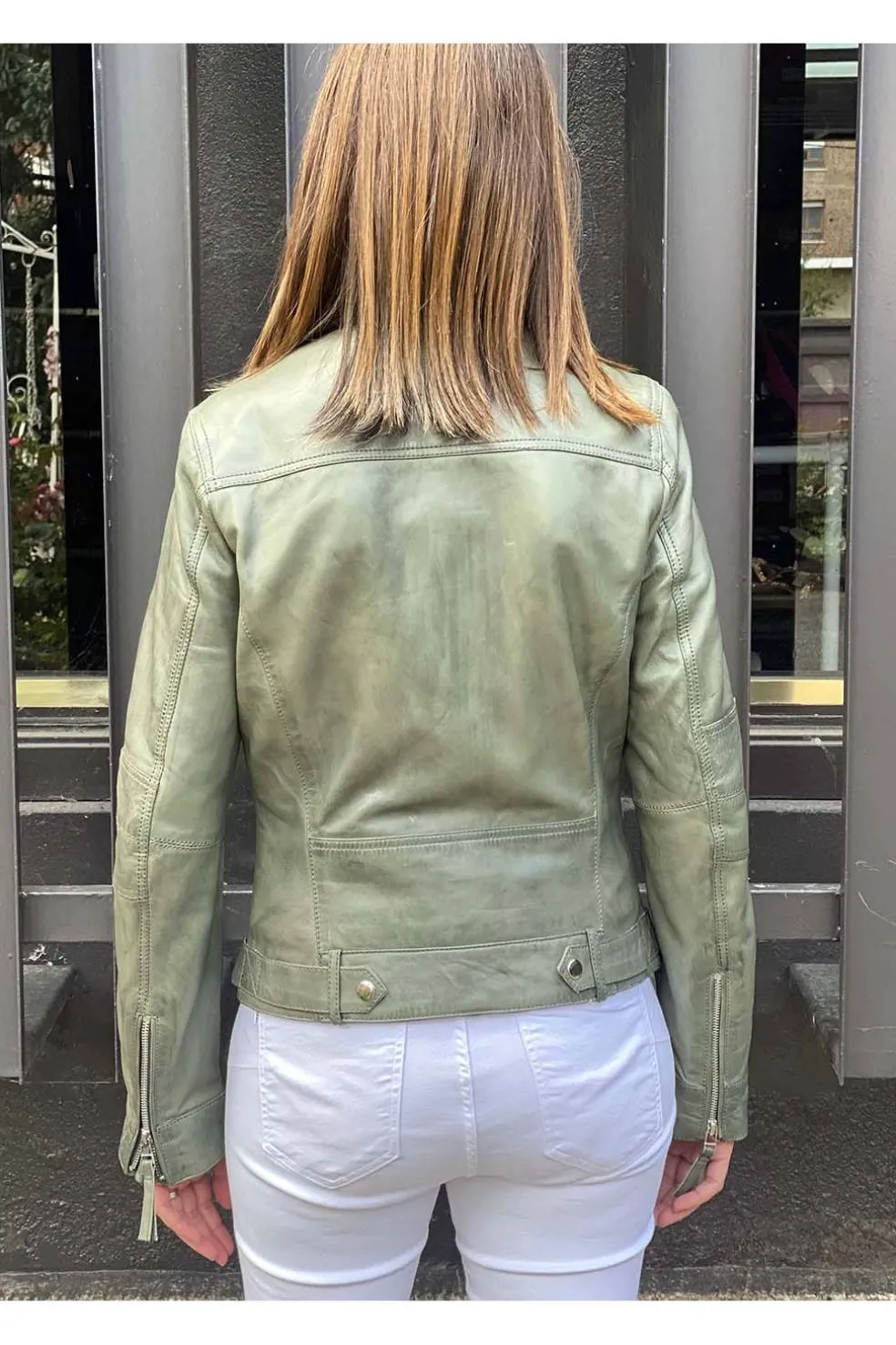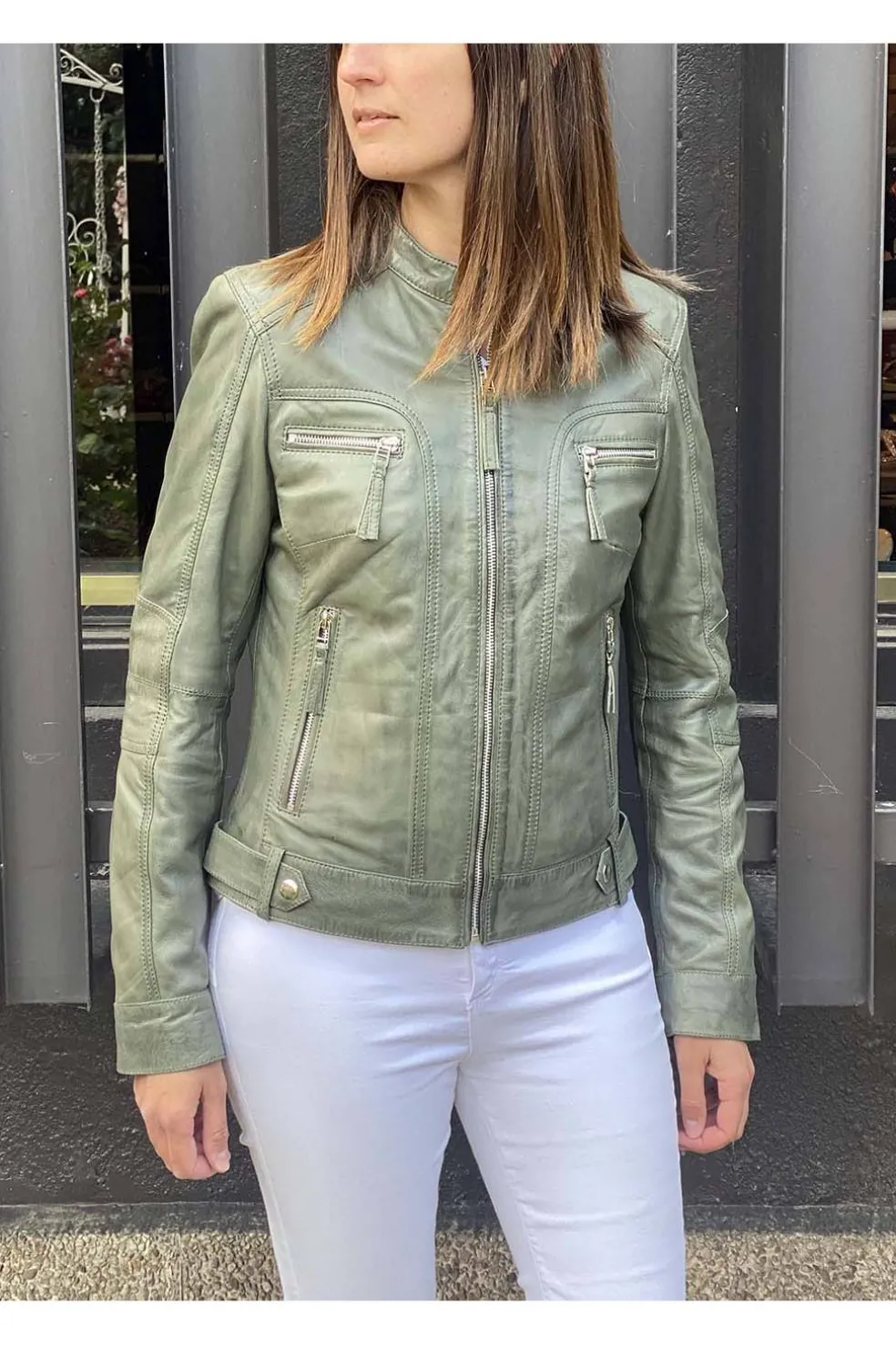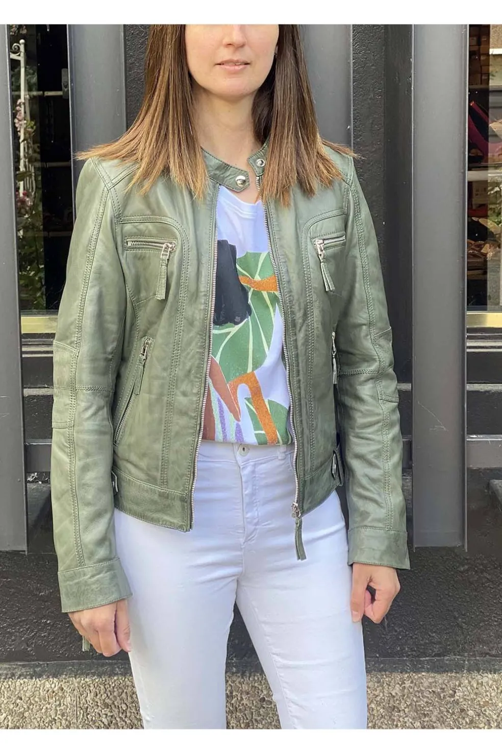 Cazadora de cuero natural de piel muy suave y ligera. Cuello tira con corchete. Se abrocha con cremallera, al igual que los bolsillos y puños. Largo de la prenda 53 cms