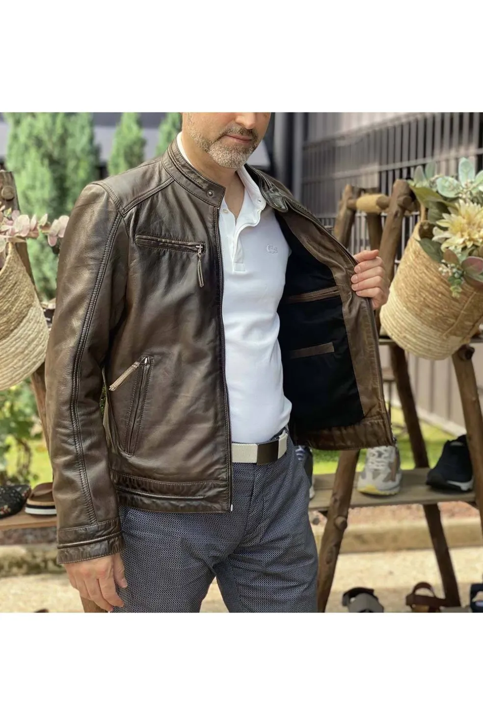 Cazadora de hombre en piel natural con cuello mao, bolsillos con cremallera. Piel muy suave y acabado vintage