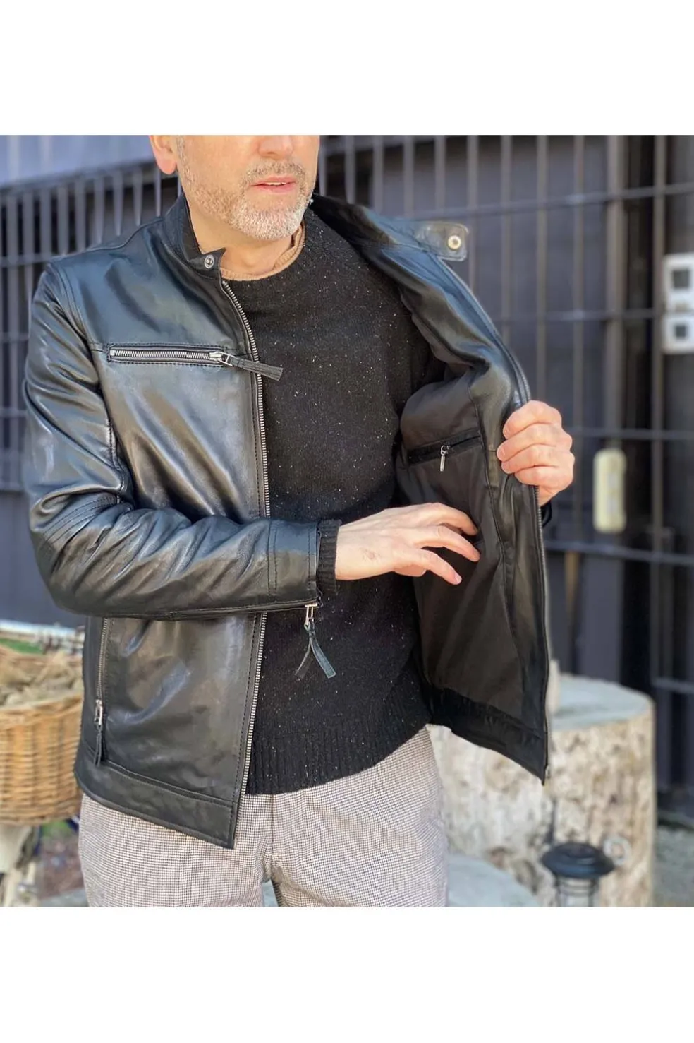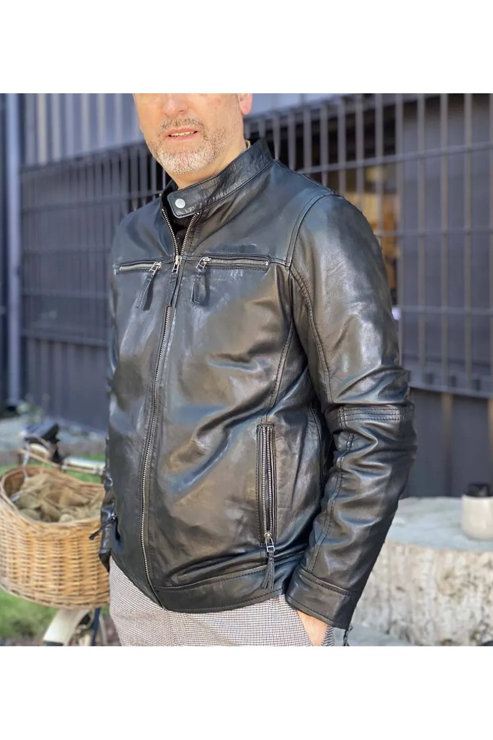Cazadora de hombre en piel natural con cuello mao, bolsillos con cremallera. Piel muy suave y ligera