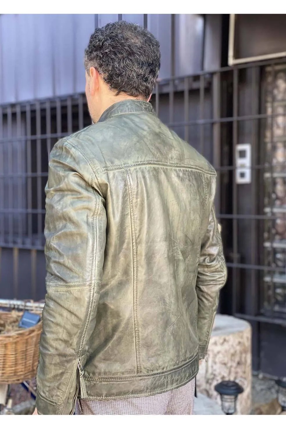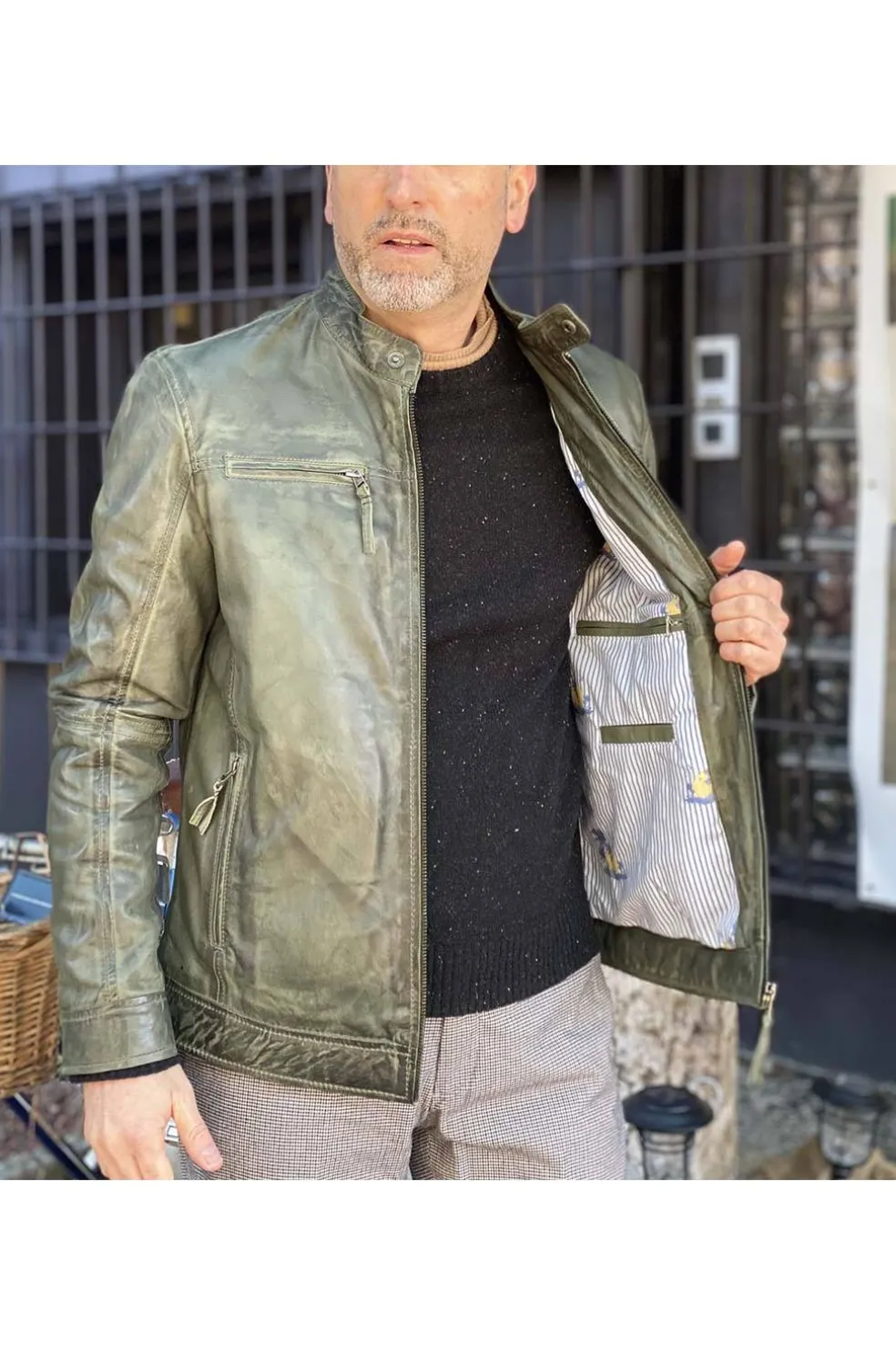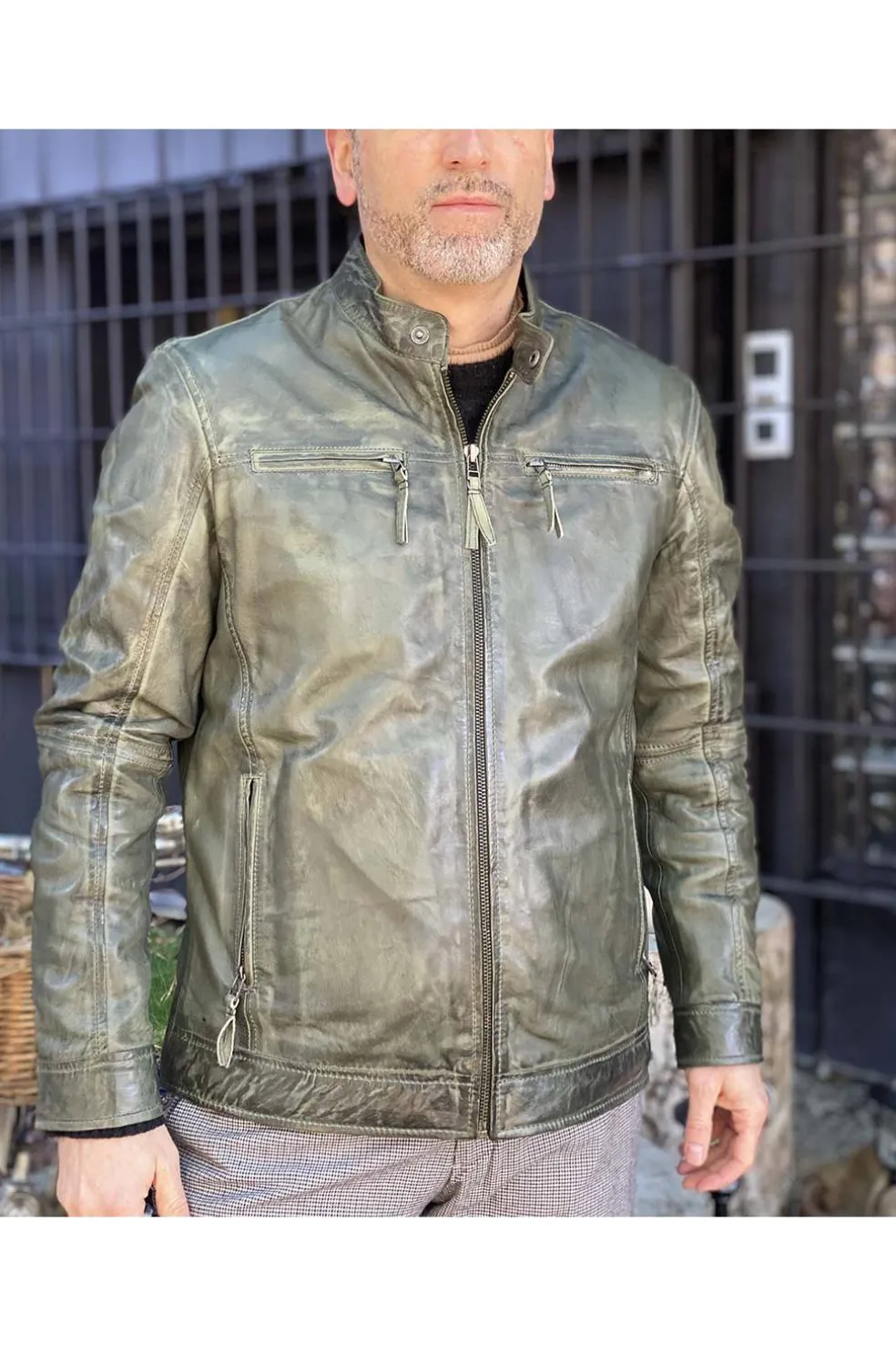 Cazadora de hombre en piel natural con cuello mao, bolsillos con cremallera.
