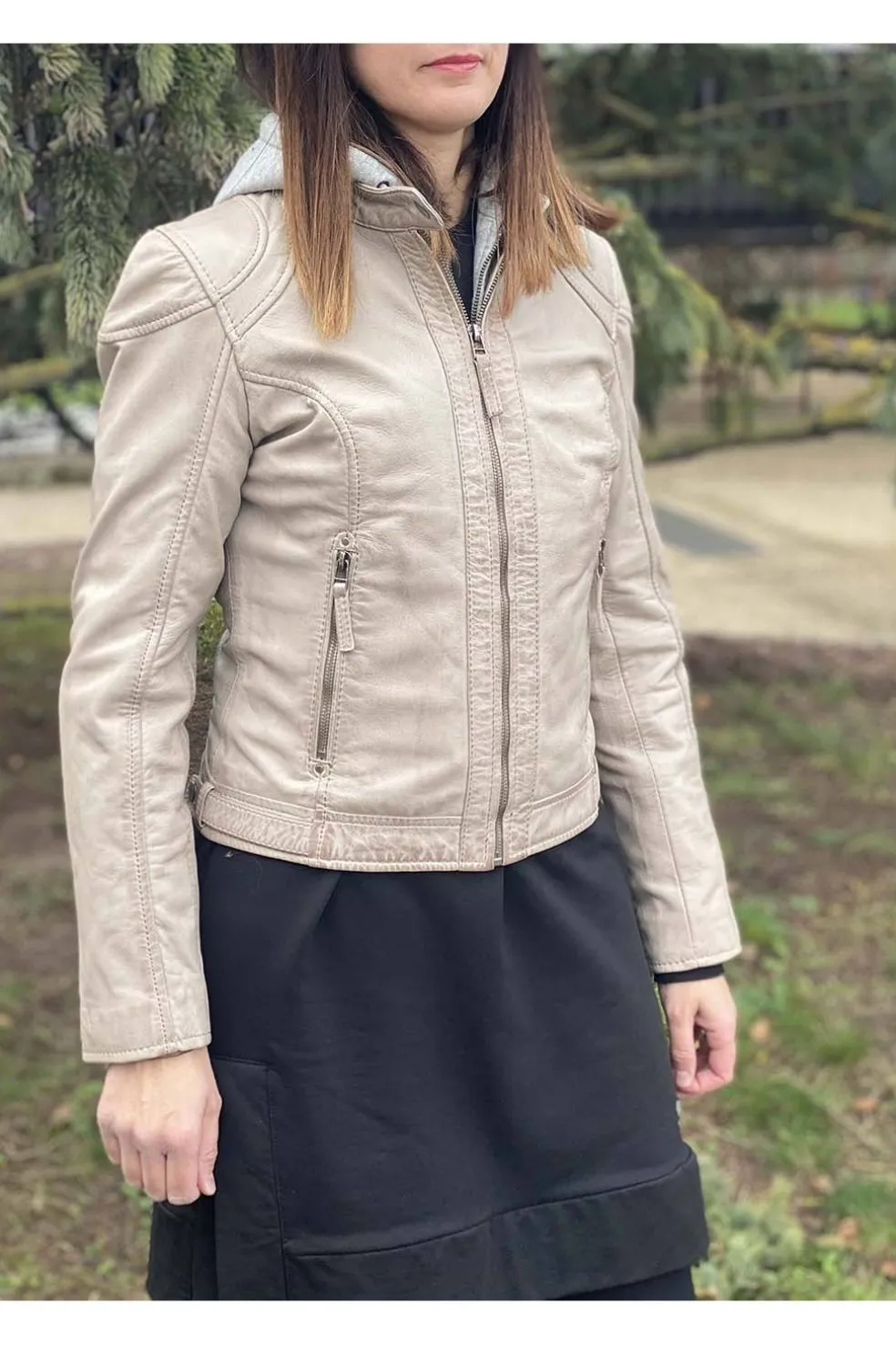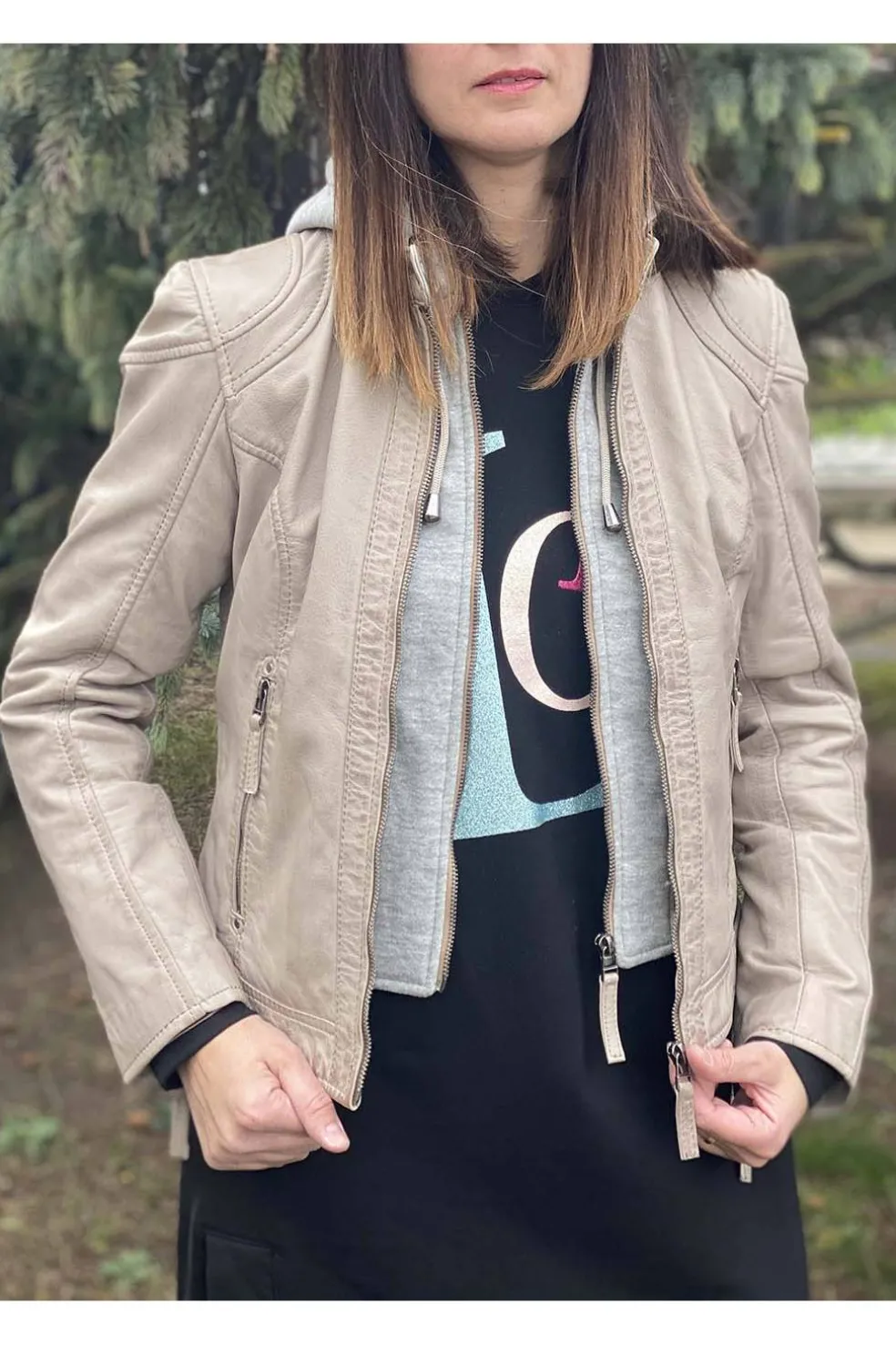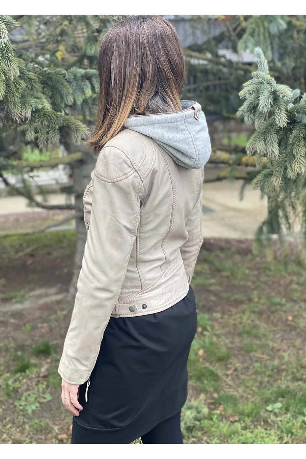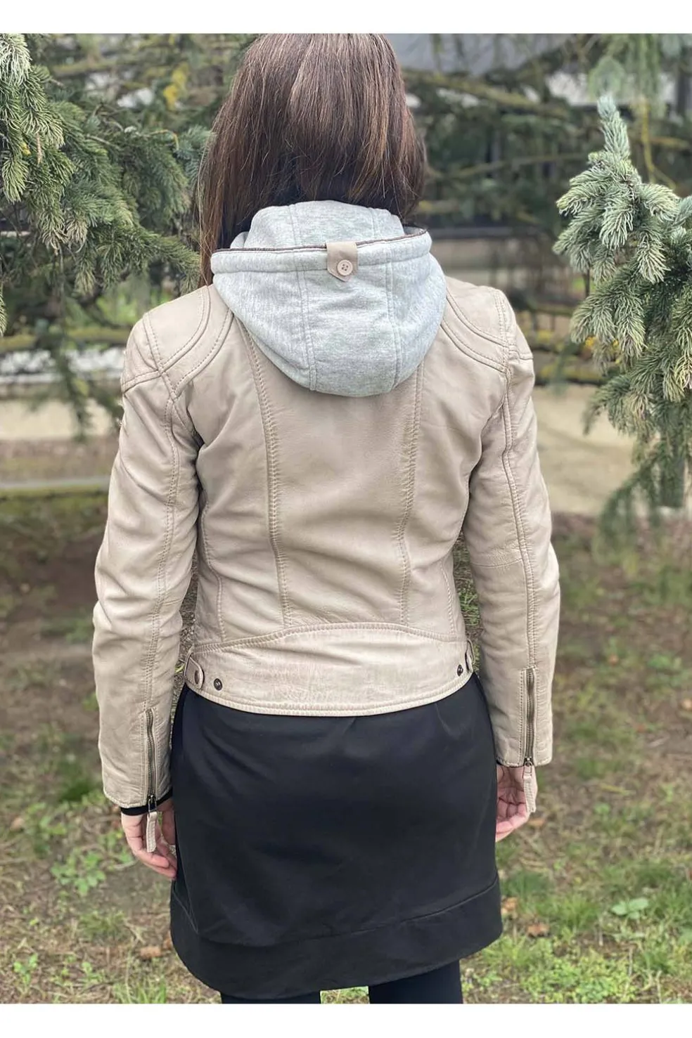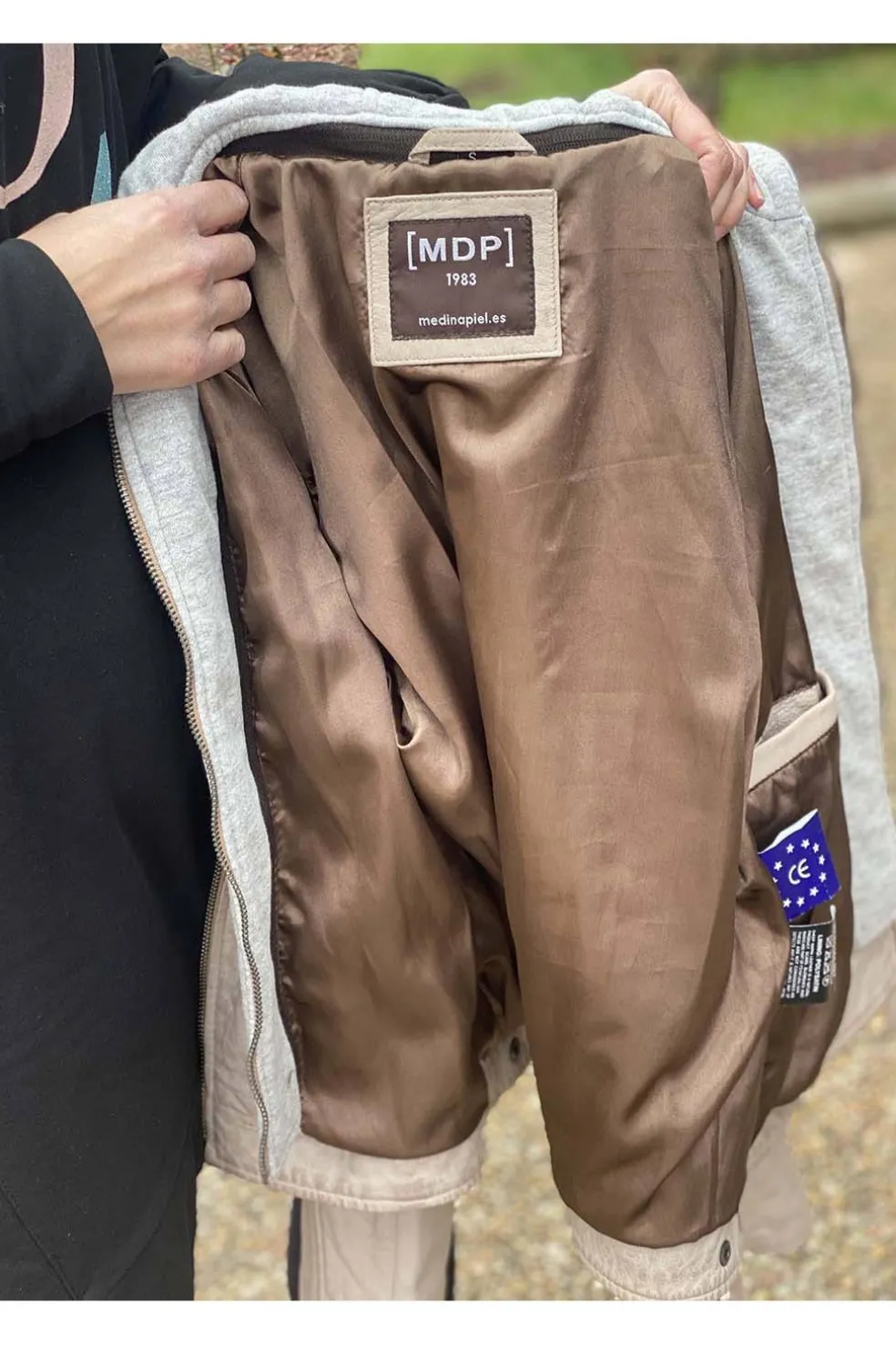 Cazadora de de piel vegetal curtida sin cromo, suave y ligera. Capucha felpa desmontable.