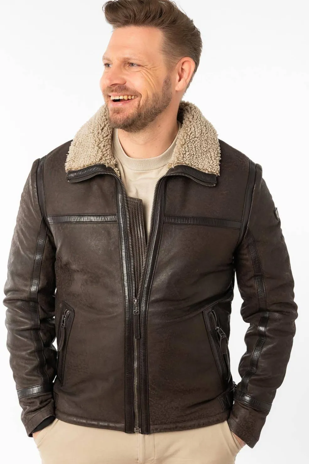 Cazadora de cuero Gipsy, una prenda que combina estilo y calidez. Con un suave borreguillo en el cuello. Cuenta con dos bolsillos laterales, dos bolsillos interiores, ofreciendo espacio práctico para tus esenciales. Ideal para un look casual y moderno, esta cazadora es perfecta para cualquier ocasión. Cuello de piel sintética