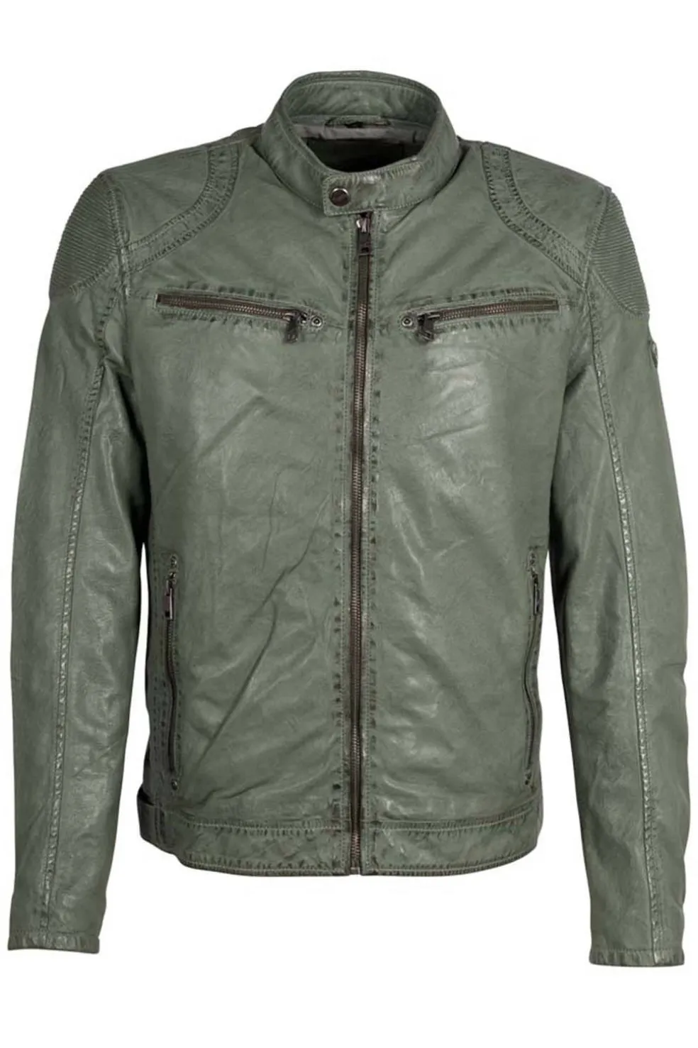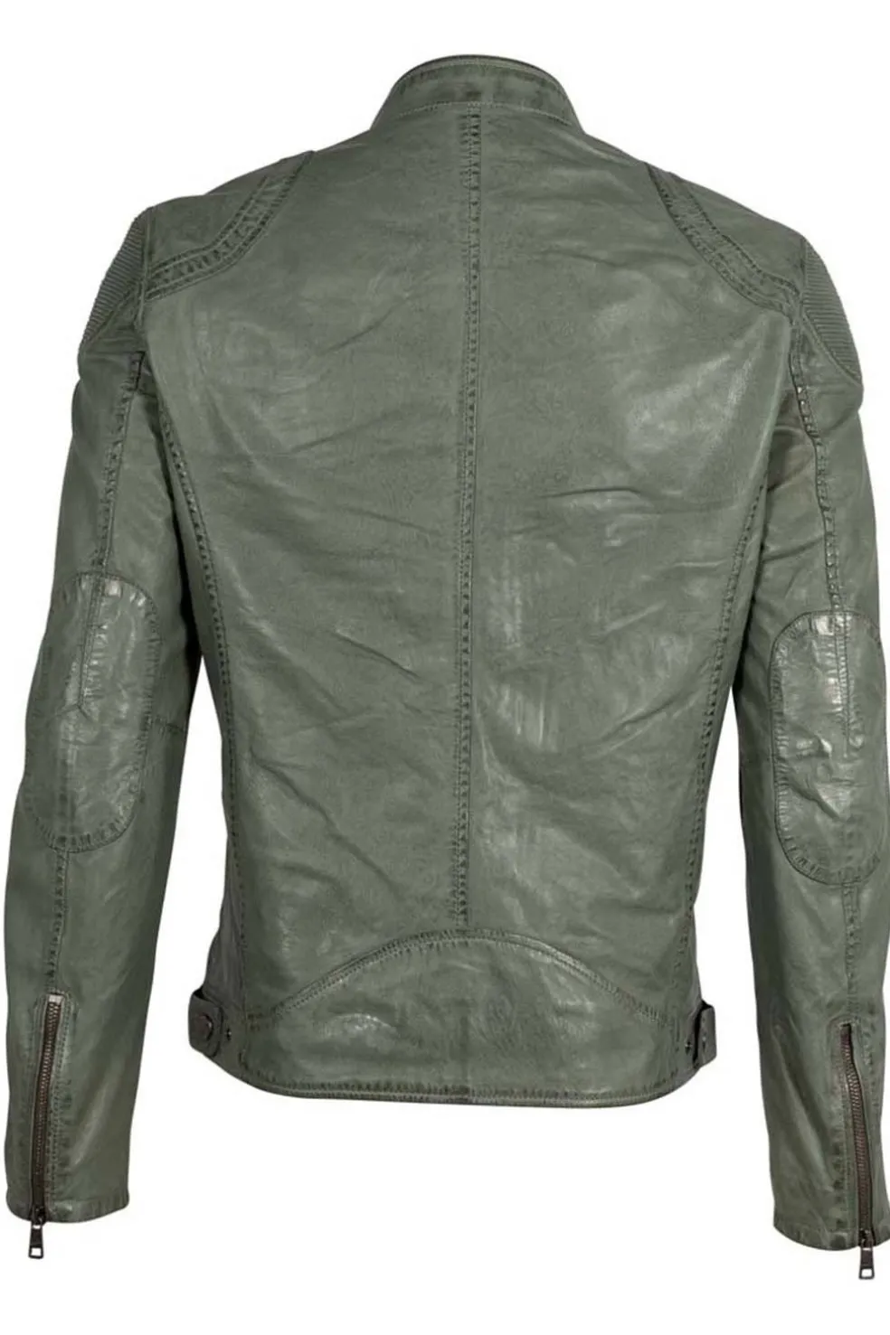 Chaqueta de motorista con cuello alto y cierre a presión. Zona de hombros acentuada con cuero elástico. Dos bolsillos horizontales en el pecho con cremallera. Dos bolsillos laterales con cremallera. Cremallera en la parte trasera de la manga. Botones ajustables en la cinturilla lateral.