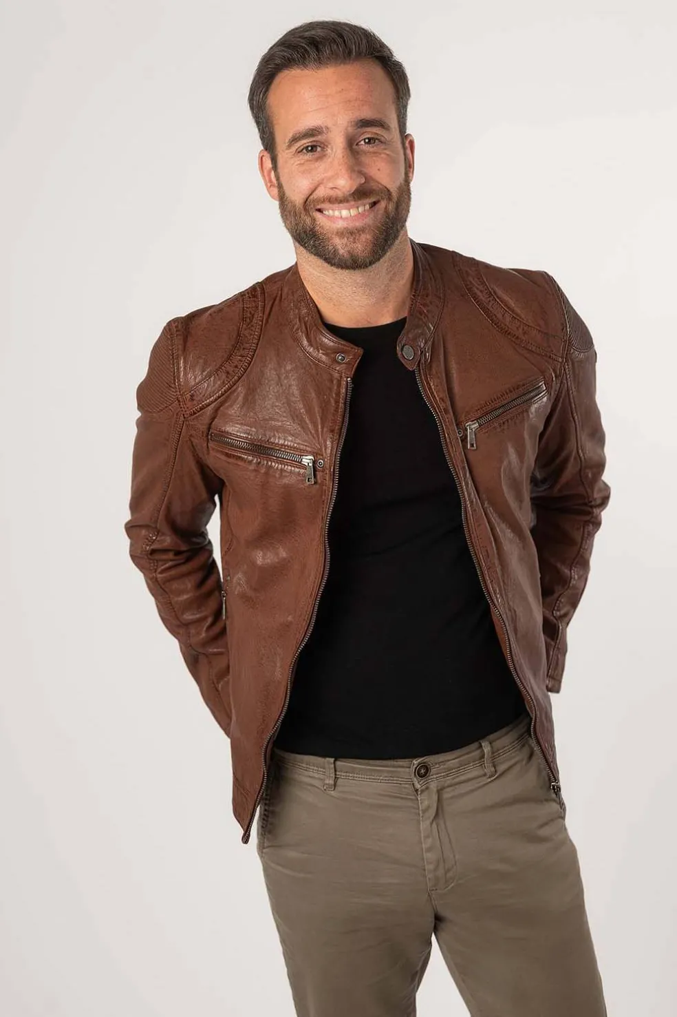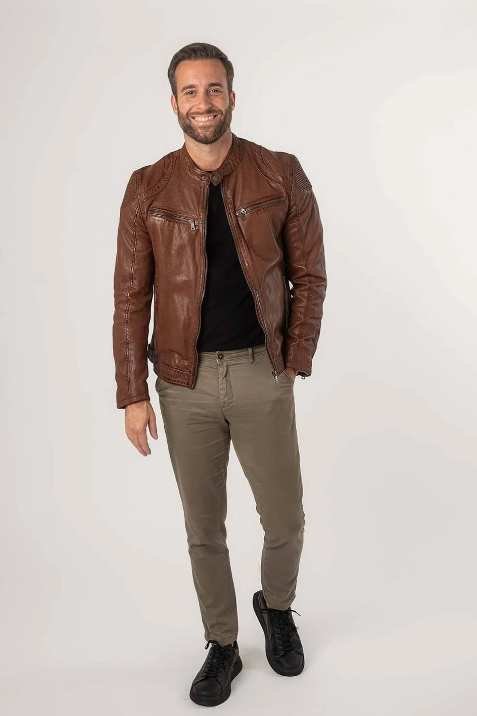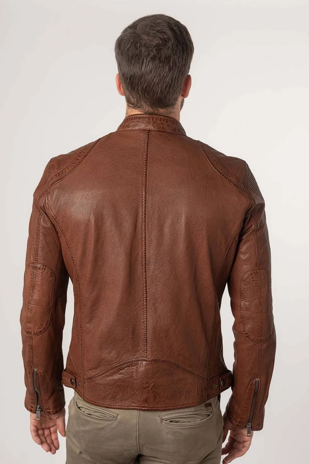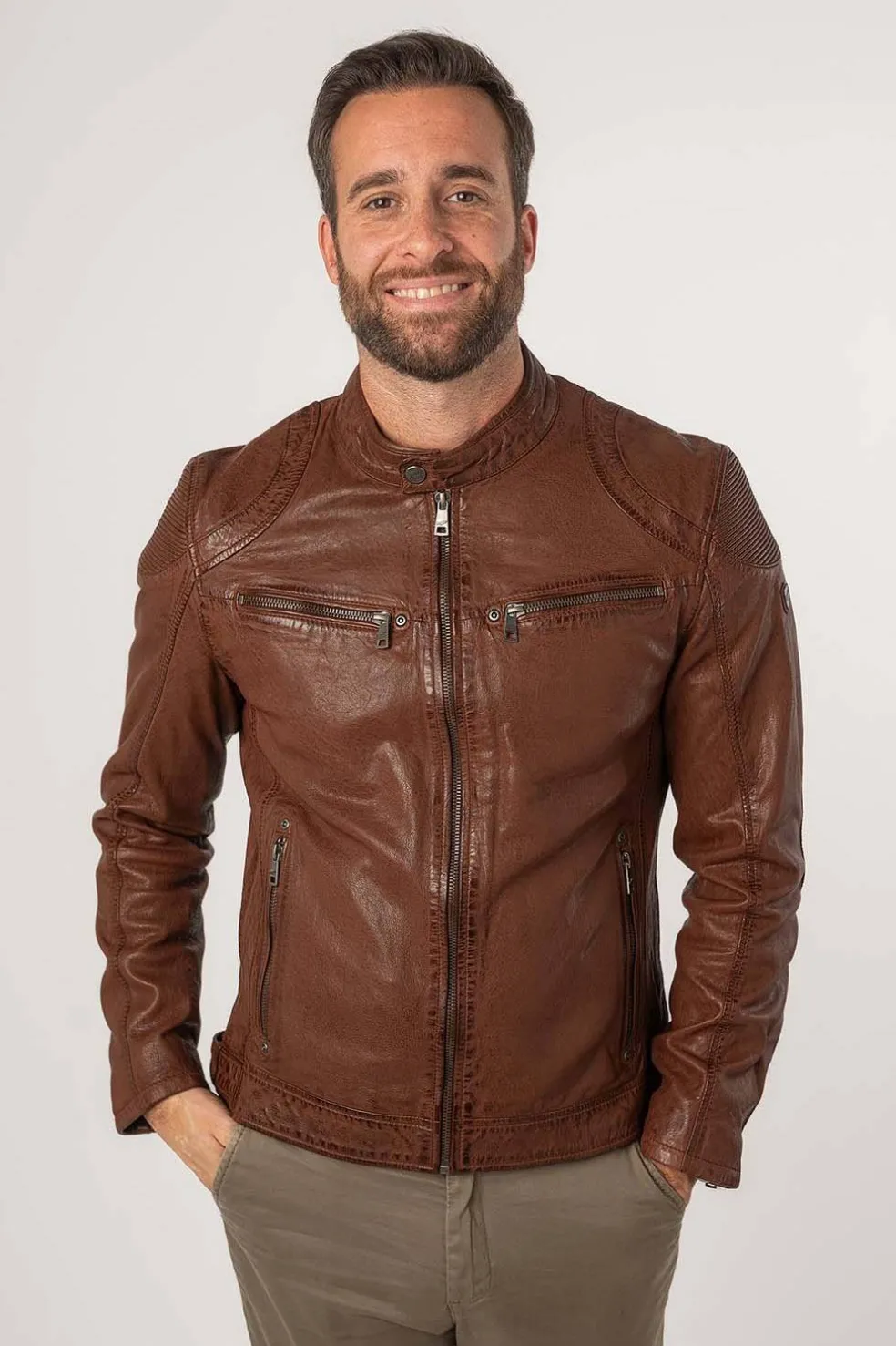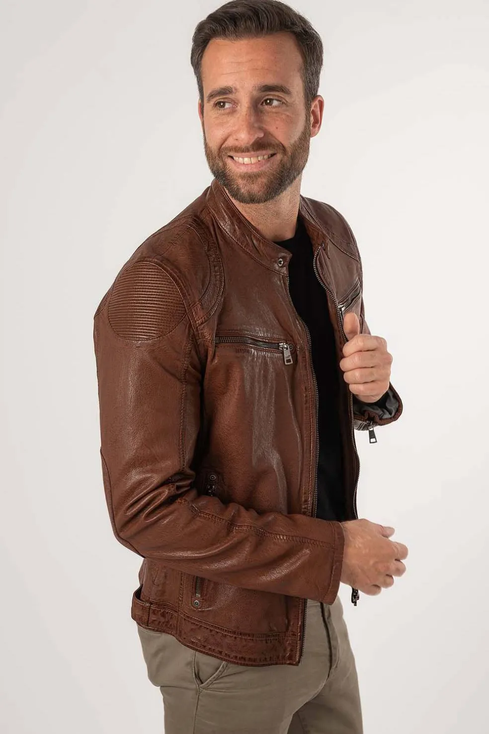 Chaqueta de motorista con cuello alto y cierre a presión. Zona de hombros acentuada con cuero elástico. Dos bolsillos horizontales en el pecho con cremallera. Dos bolsillos laterales con cremallera. Cremallera en la parte trasera de la manga. Botones ajustables en la cinturilla lateral.