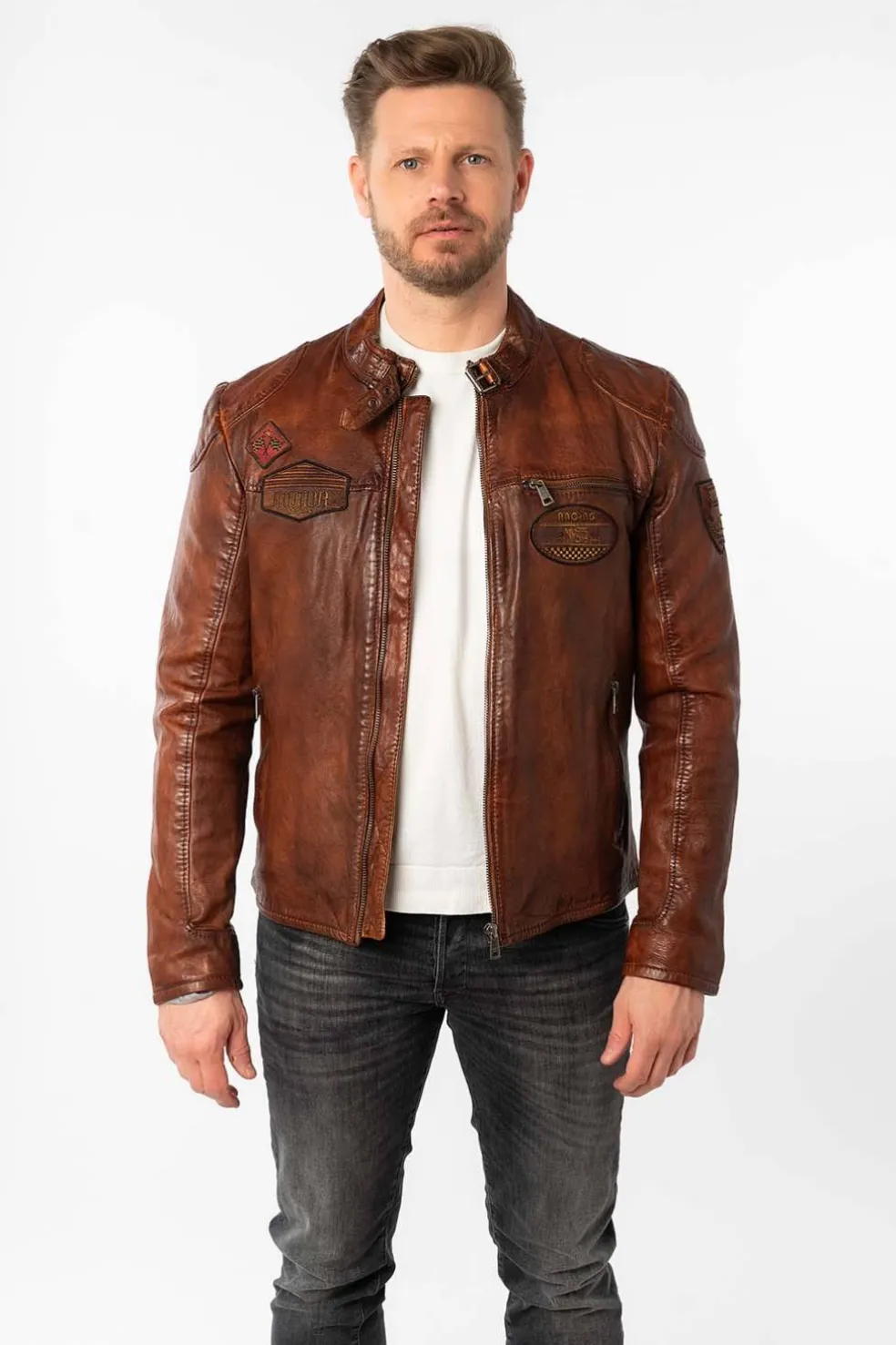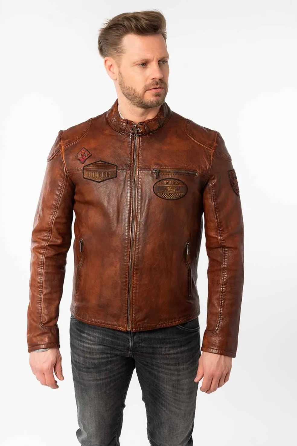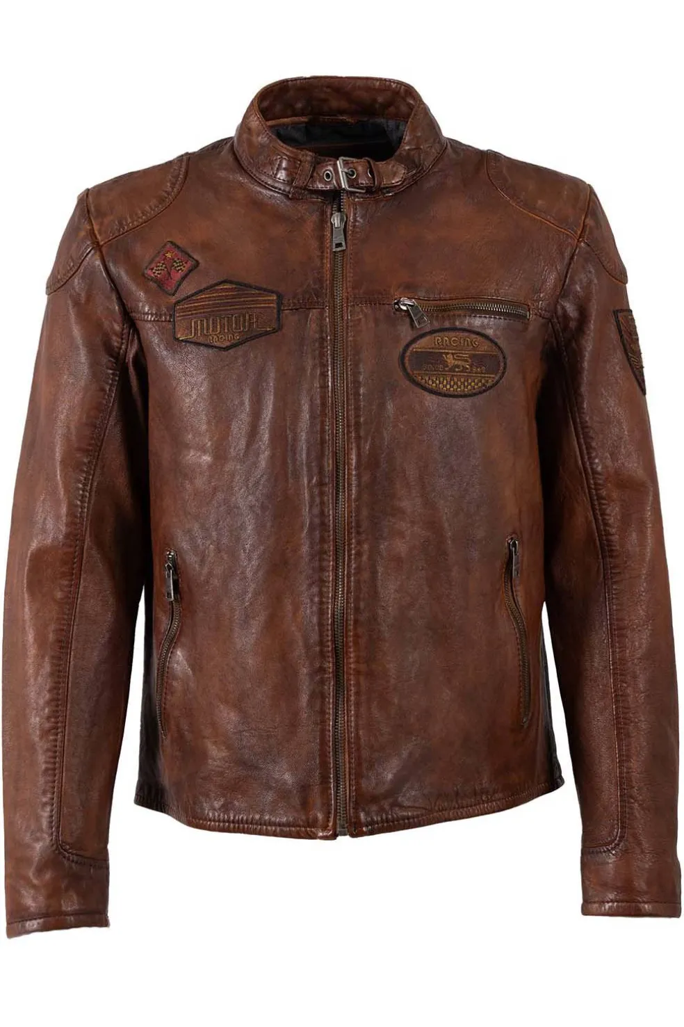 Esta cazadora de cuero de Mauritius, confeccionada en piel natural de cordero, ofrece un ajuste regular fit y un diseño moderno. Con bolsillos delanteros con cremallera, detalle de parches y cierre con cremallera.